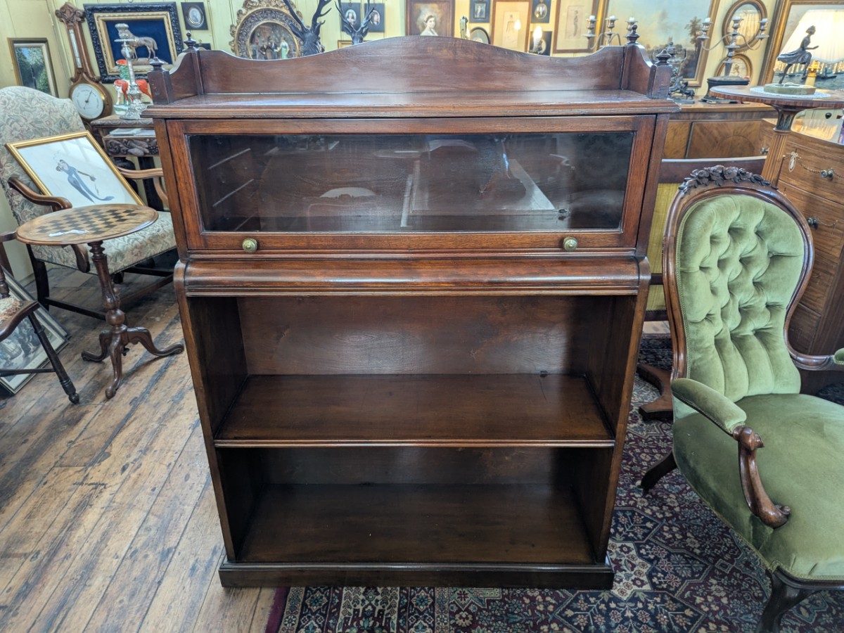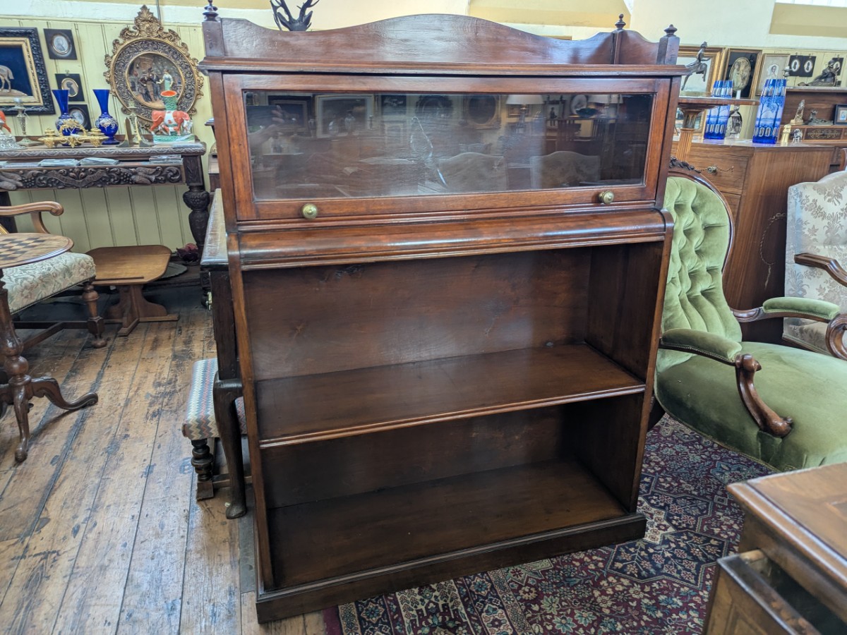 Two open shelves, 1 open/shut glazed compartment, fitted round brass handles. Bookcase stands on a plinth base. Measures 41'' long, 52'' high, 12'' deep.