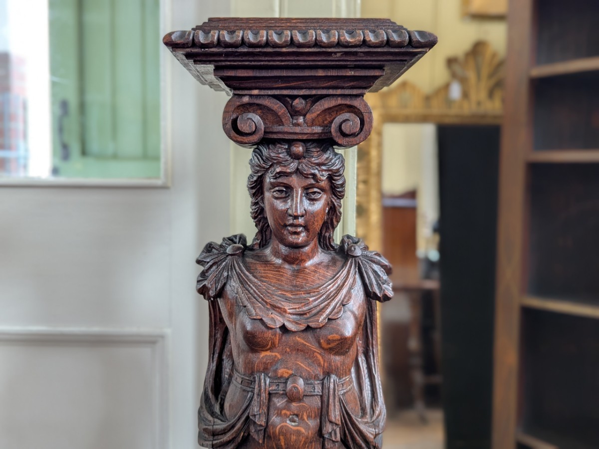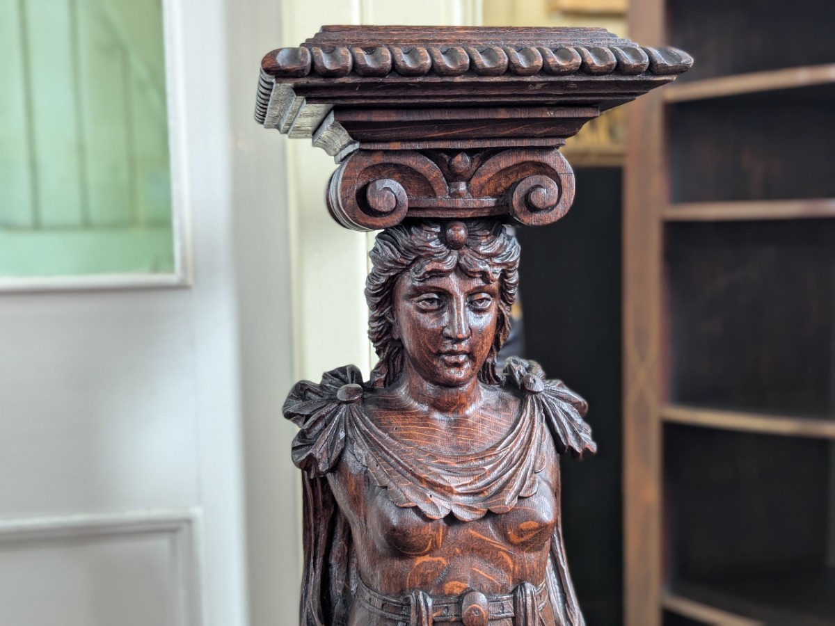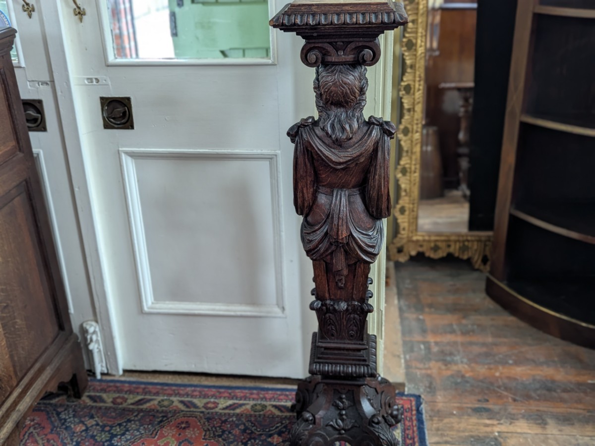 From the Victorian Gothic Period, a finely carved figure, candle or plant stand. Measures 45'' high. Stands on lion paw feet.