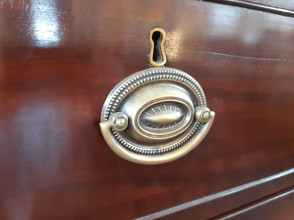 Here is a mahogany chest of 2 long and 2 short drawers with brass handles. From the 1830's it stands 32'' high, 43'' wide & 21'' deep.