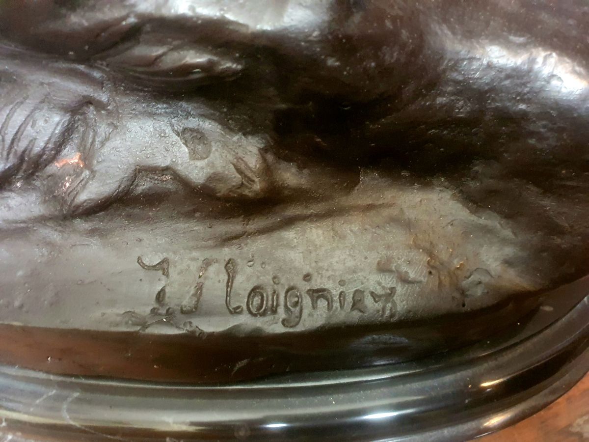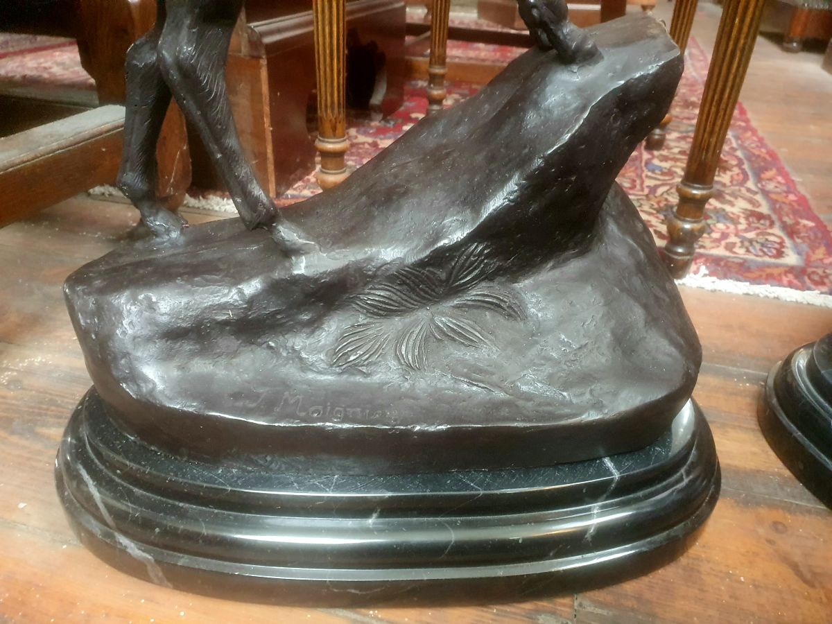 Signed J. Moigniez, standing on polished black marble bases. Height 29½'', marble base length 16''