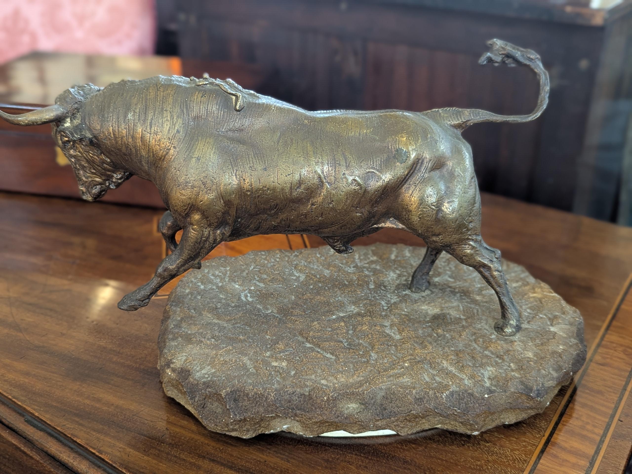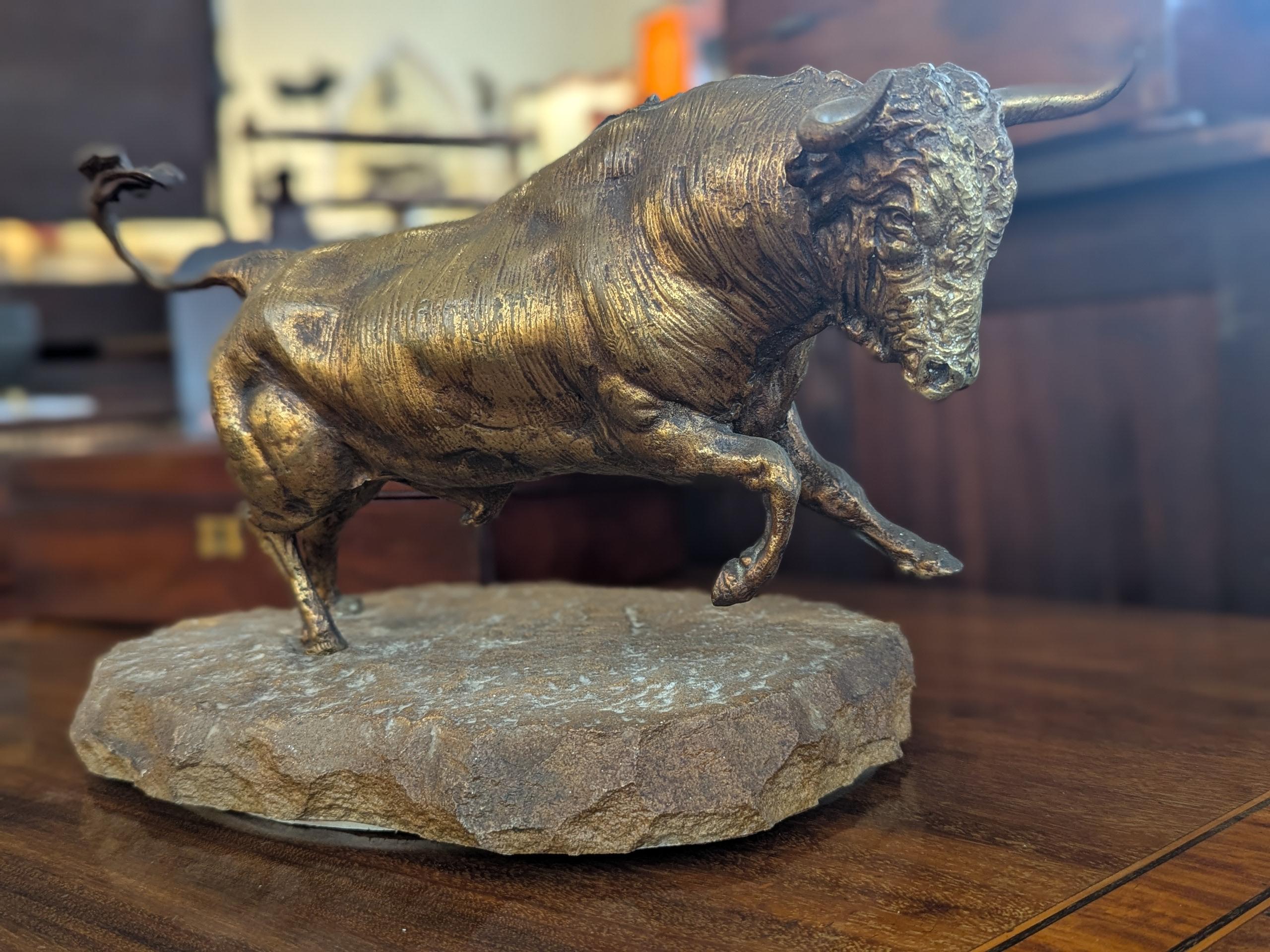 • Late 19th Century Gilt Bronze Charging Bull On Stone Base