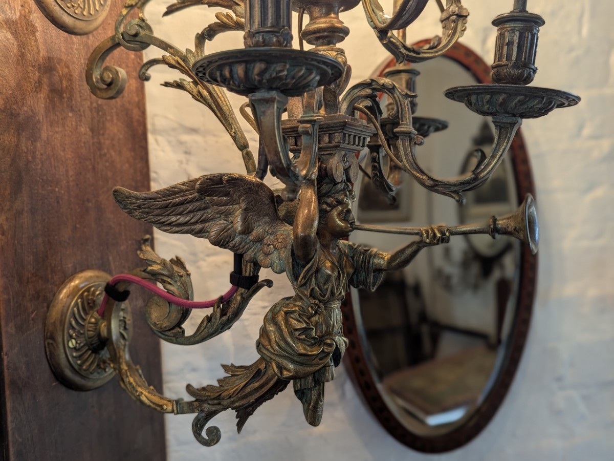 Large and impressive, it is supported by a winged angel. Converted to electricity, rewired and tested. Mounted on mahogany plaque. Approximate height of candelabra 27''.