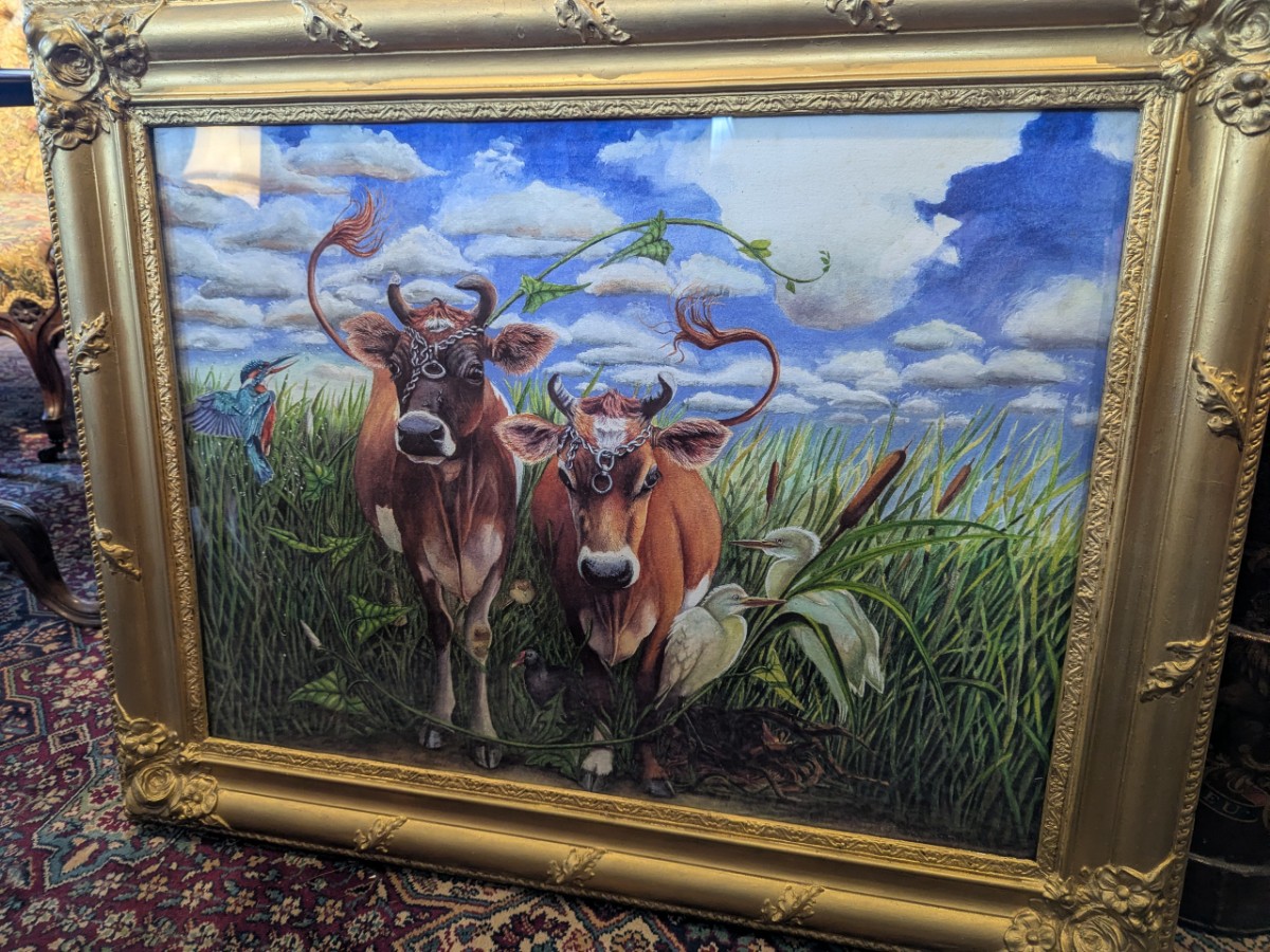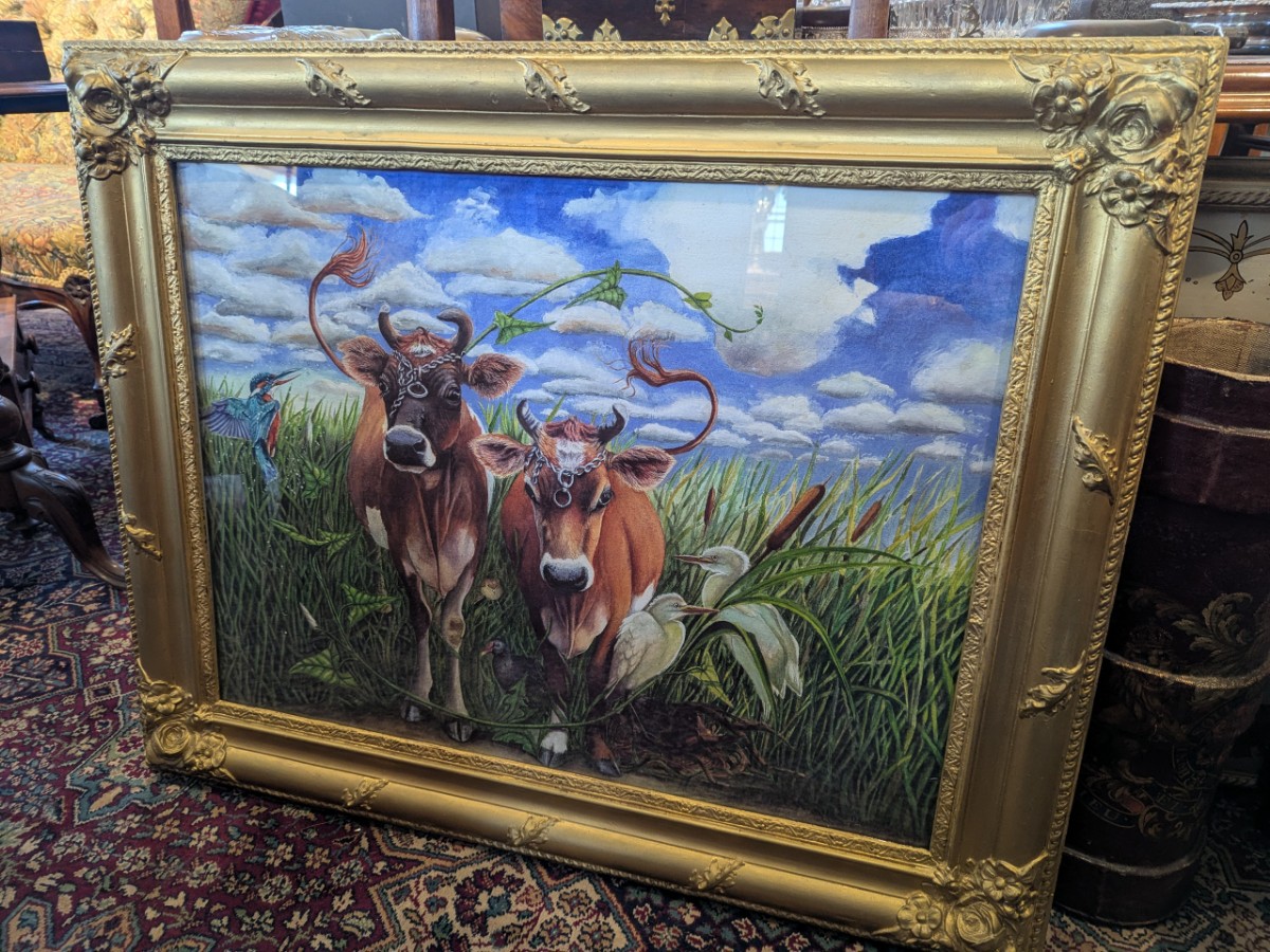 Signed giclee print from an original watercolour and gouache painting by Clare McFarlane. Painted from photographs of Jersey cows wearing chains on their heads taken at a farm gate in Trinity, Jersey in 1996. The gilt gesso frame is French 18th Century.