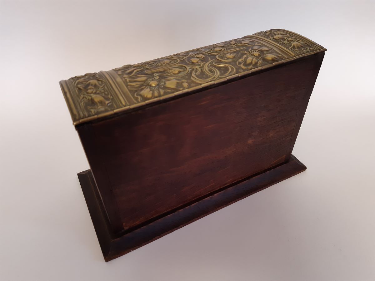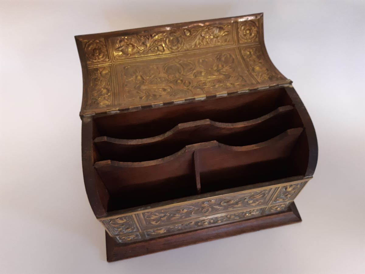 Here is an embossed brass and oak stationery box, c.1900. Good condition. Measures 9'' long.