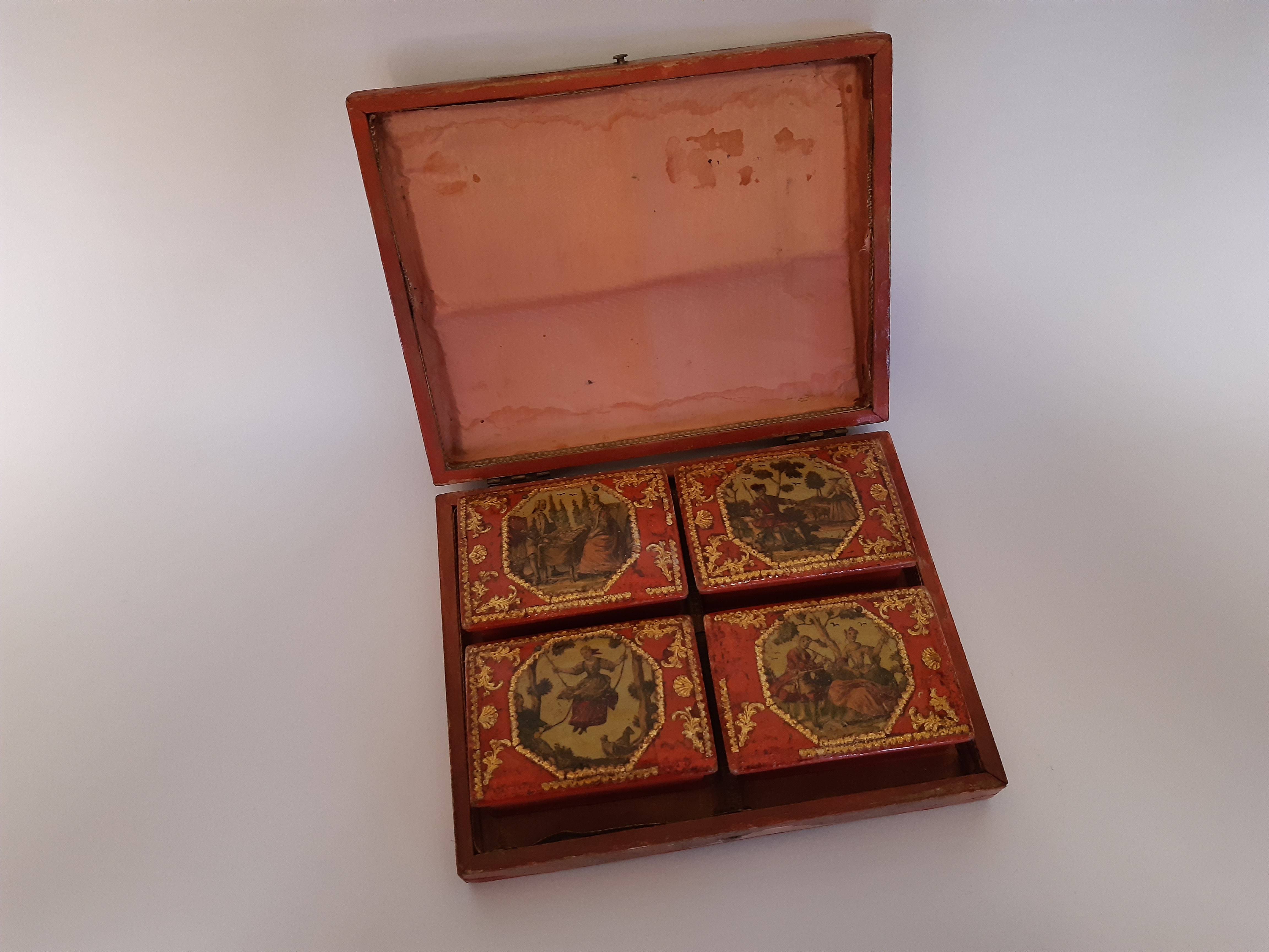 Here is a transfer decorated dome top box with 4 smaller boxes enclosed. Measurements are 7 ½'' long x 6'' deep. Some wear on the main box.