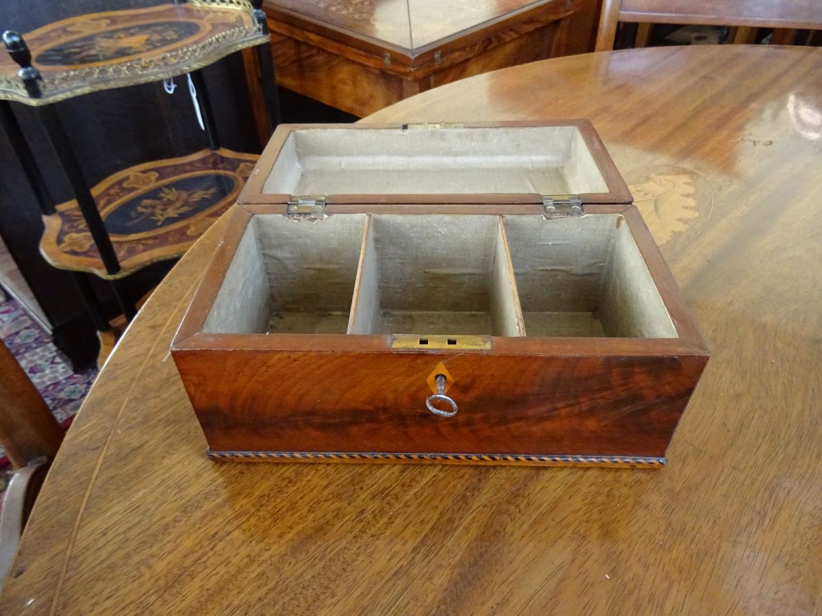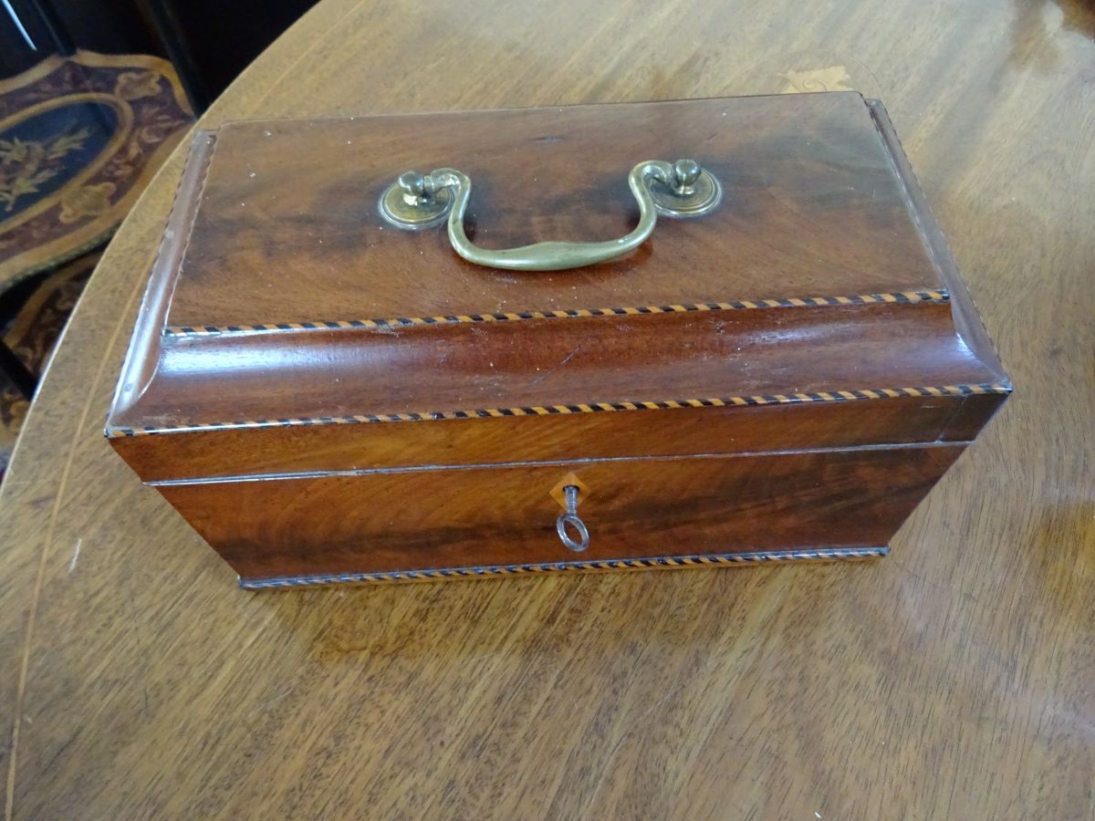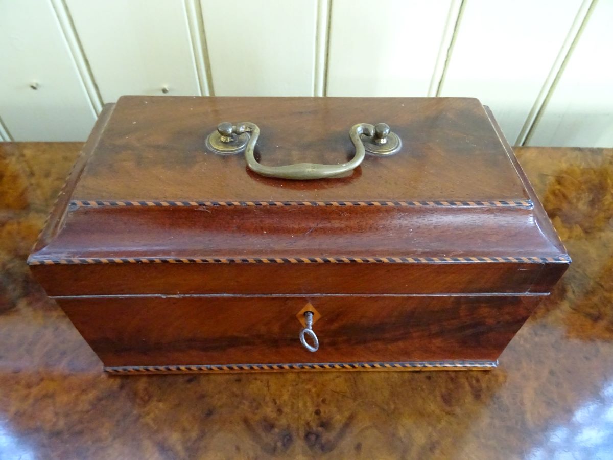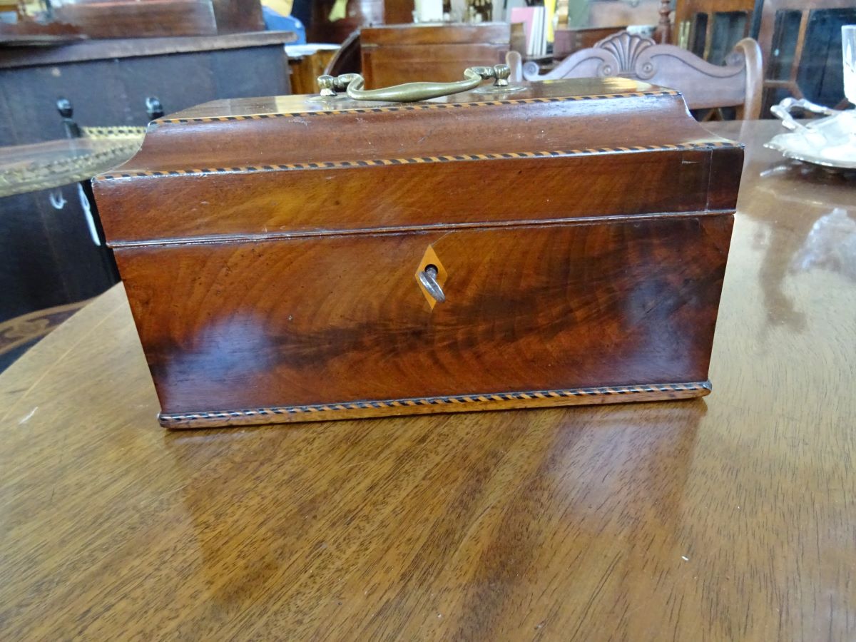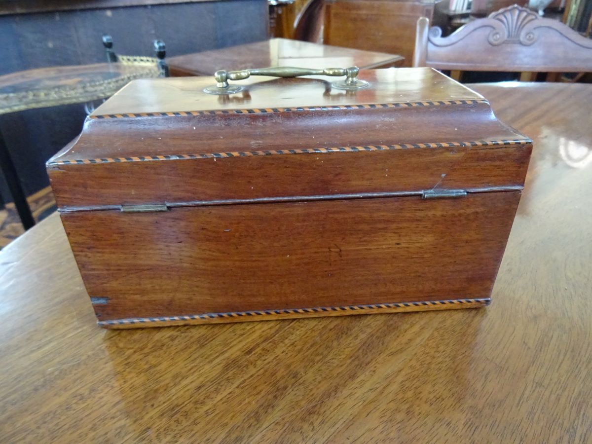 Here is a fine Georgian tea caddy, mahogany with boxwood line inlay. The shaped lid has original brass handle, stands on bracket feet. Good condition. Measures 9.5'' long.