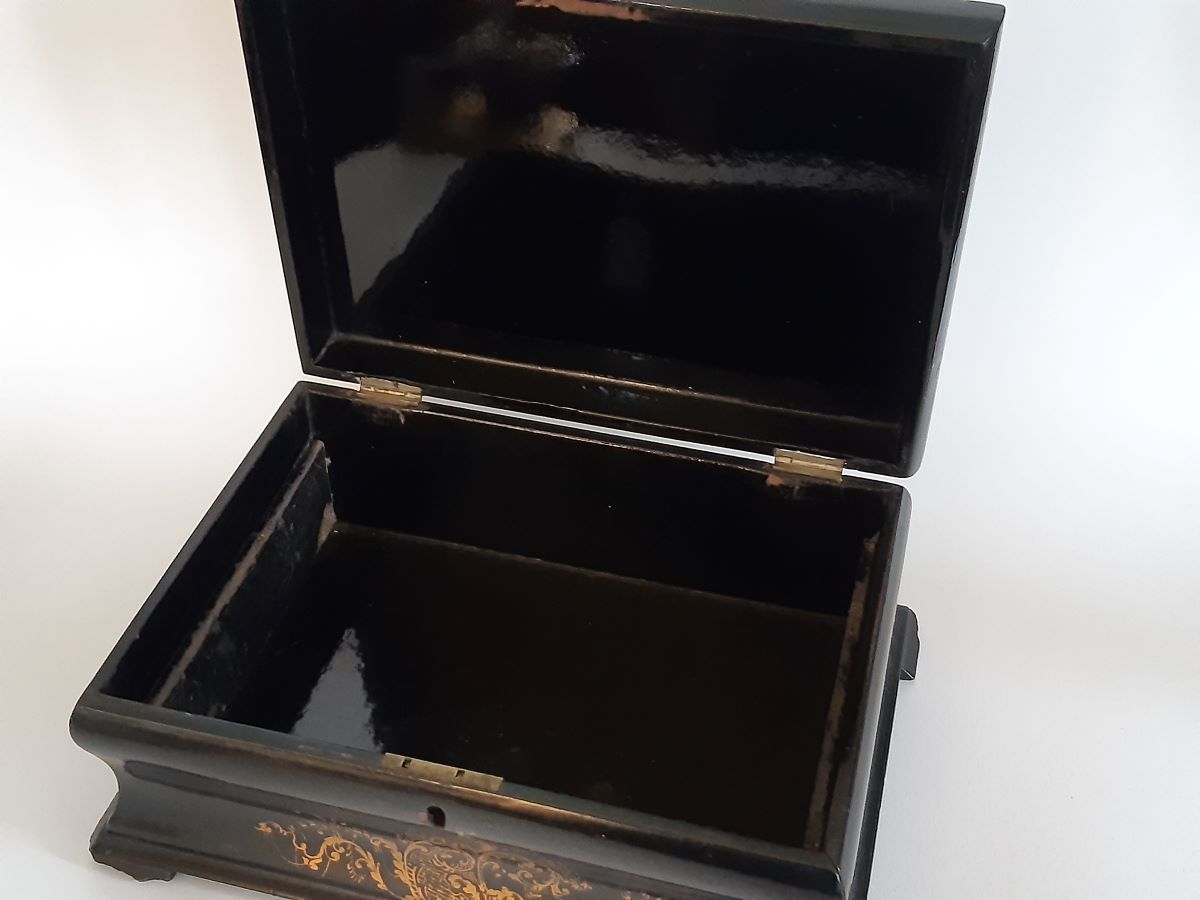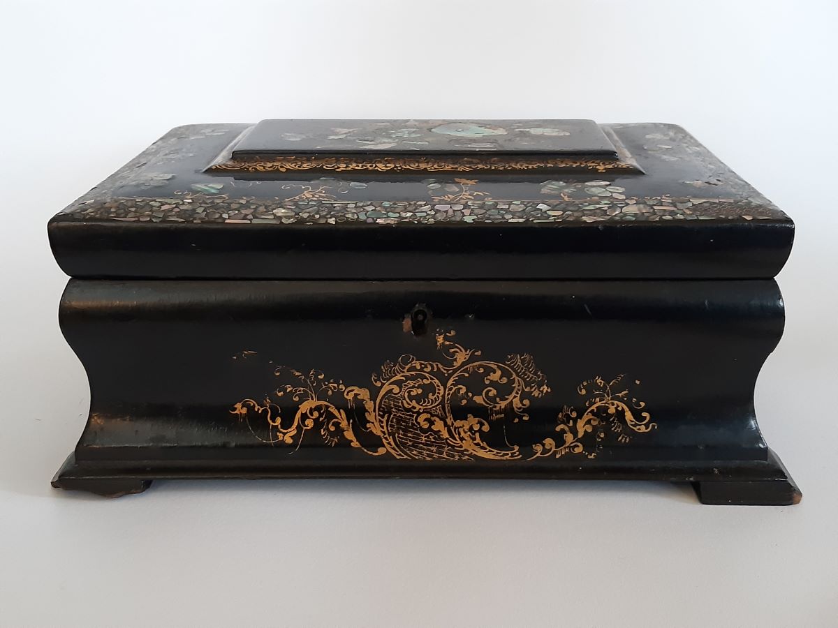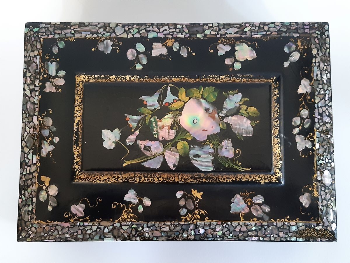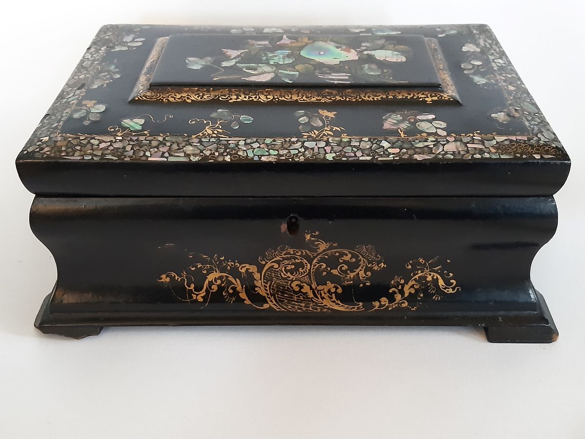 Here is a Papier-Mache box with mother of pearl, painted and gilded decoration. Good condition, measures 10'' long.