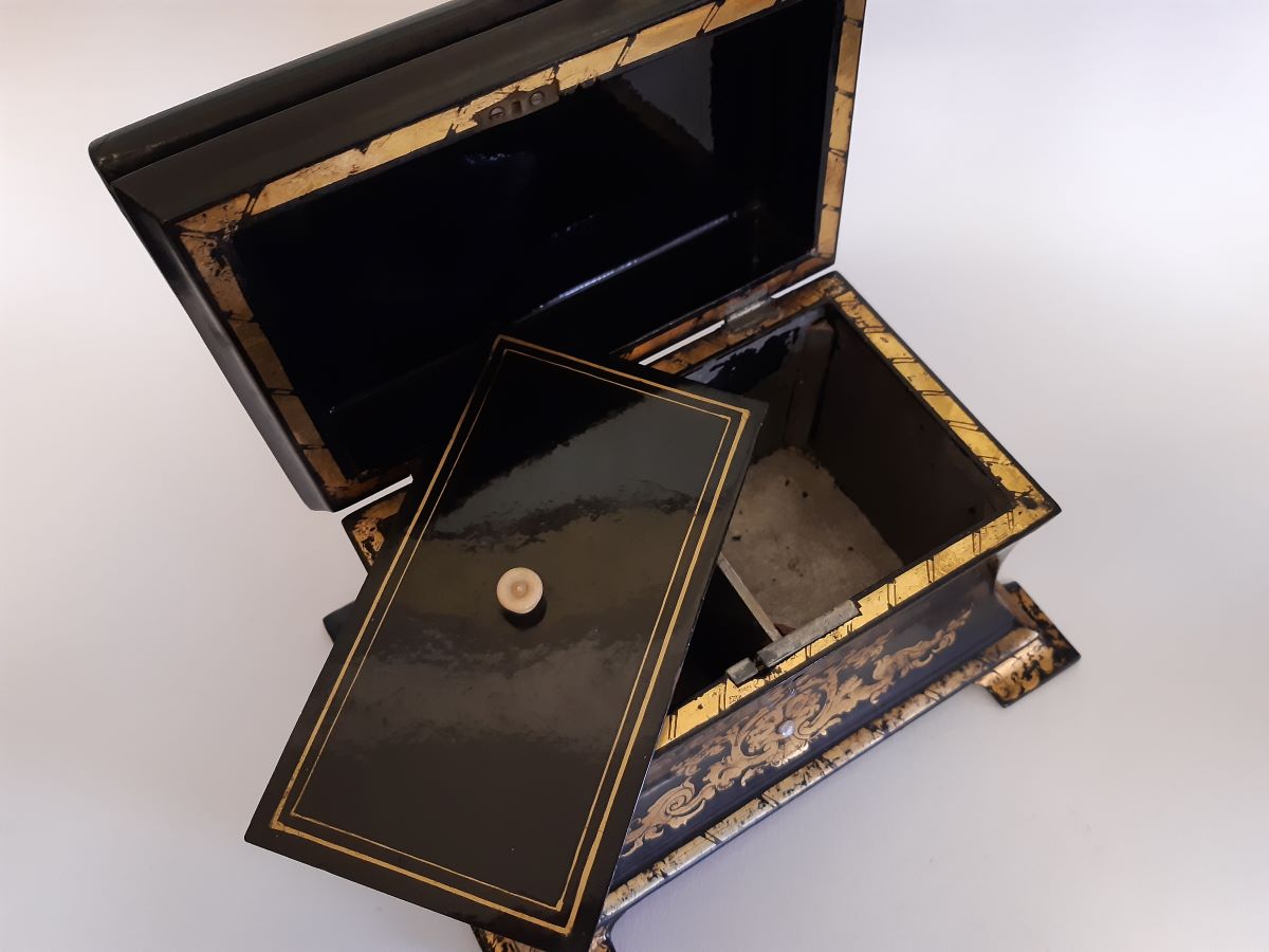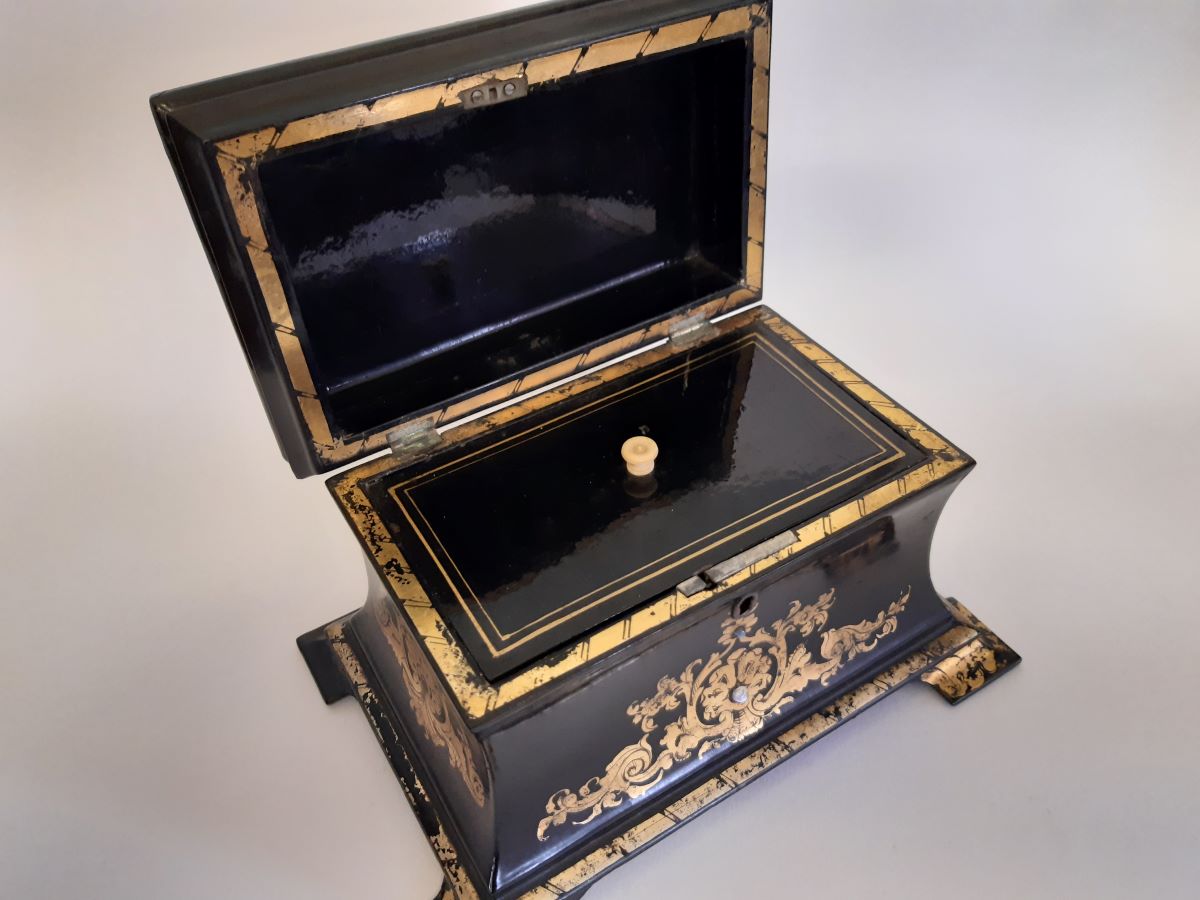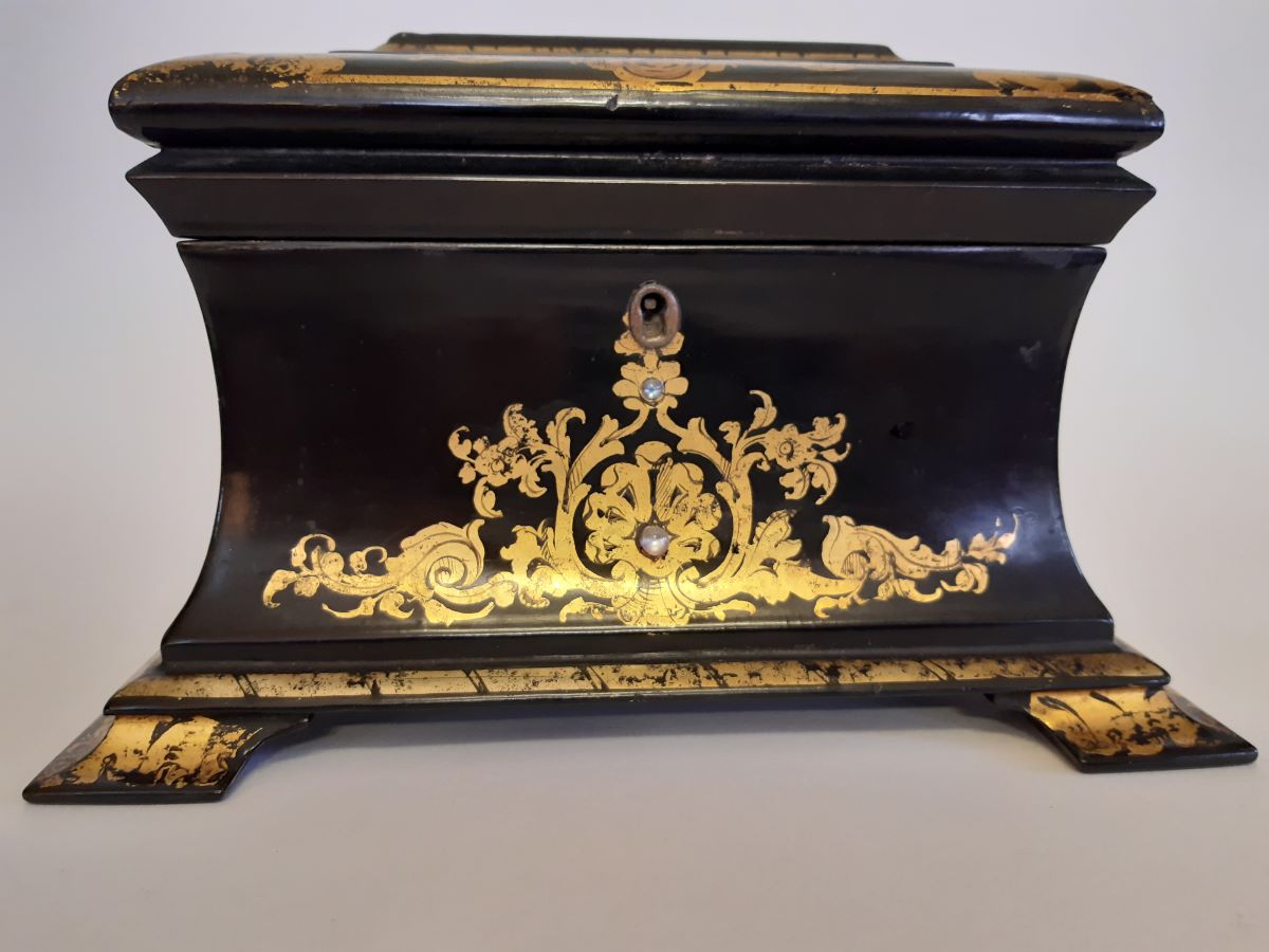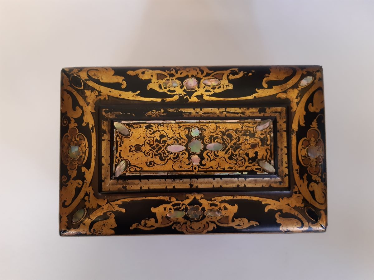 • Victorian Papier-mache with mother of pearl tea caddy
