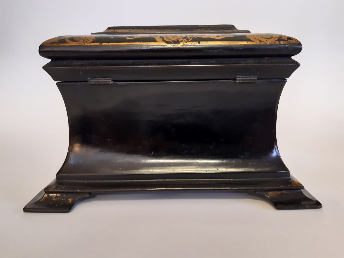 Here is a good papier-mache tea caddy, with concave sides, gilded and mother of pearl inlaid decoration all over. Measures 8¼'' wide. Excellent condition.