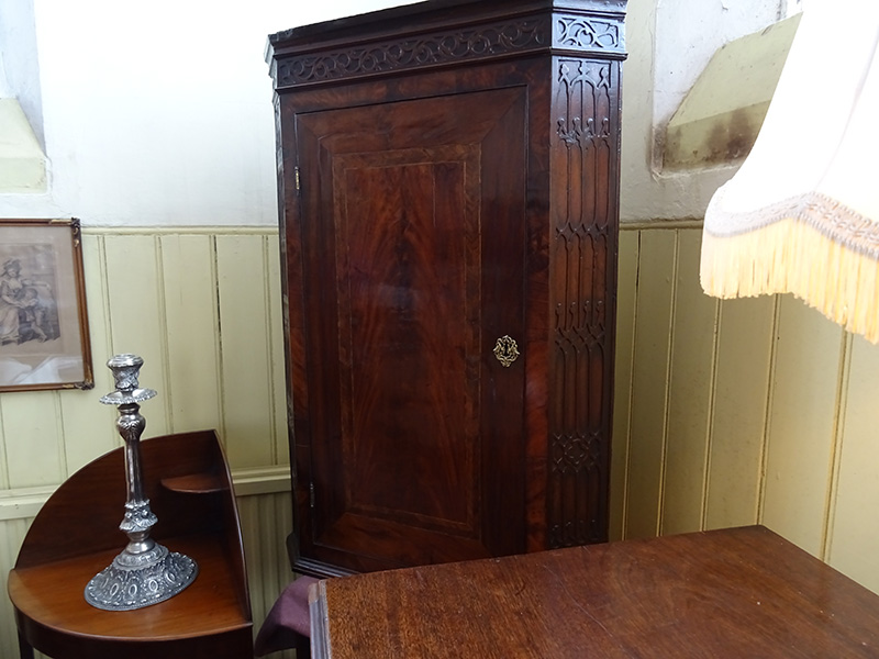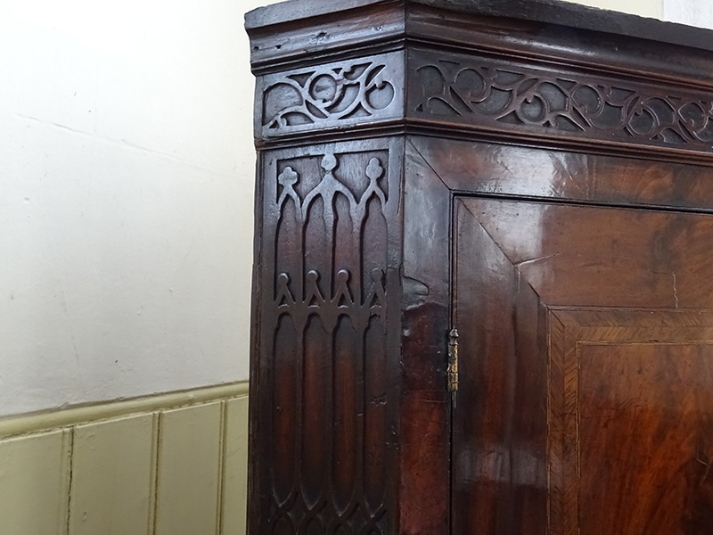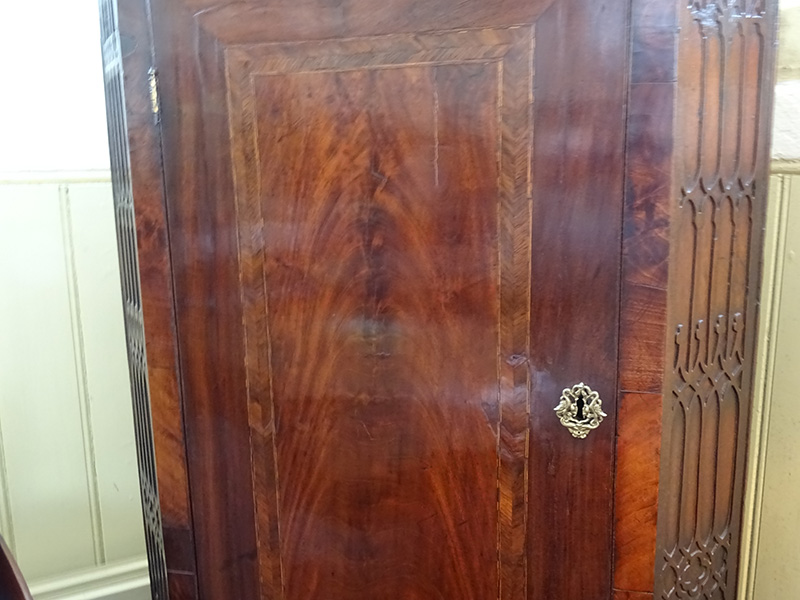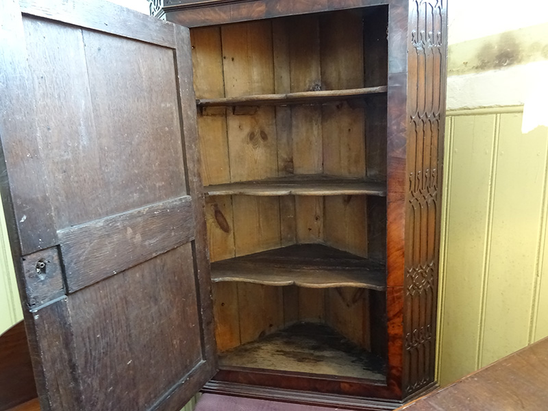 Here is a fine hanging cupboard made in the mid 1700's from mahogany, front crossbanded, door has stringing around the panel, fret work along the top. Good quality and good condition. Measures 42 inches high, 30 inches wide.