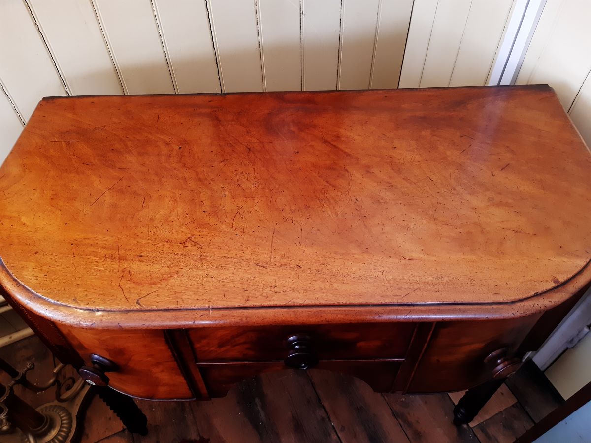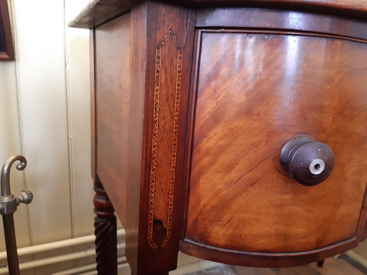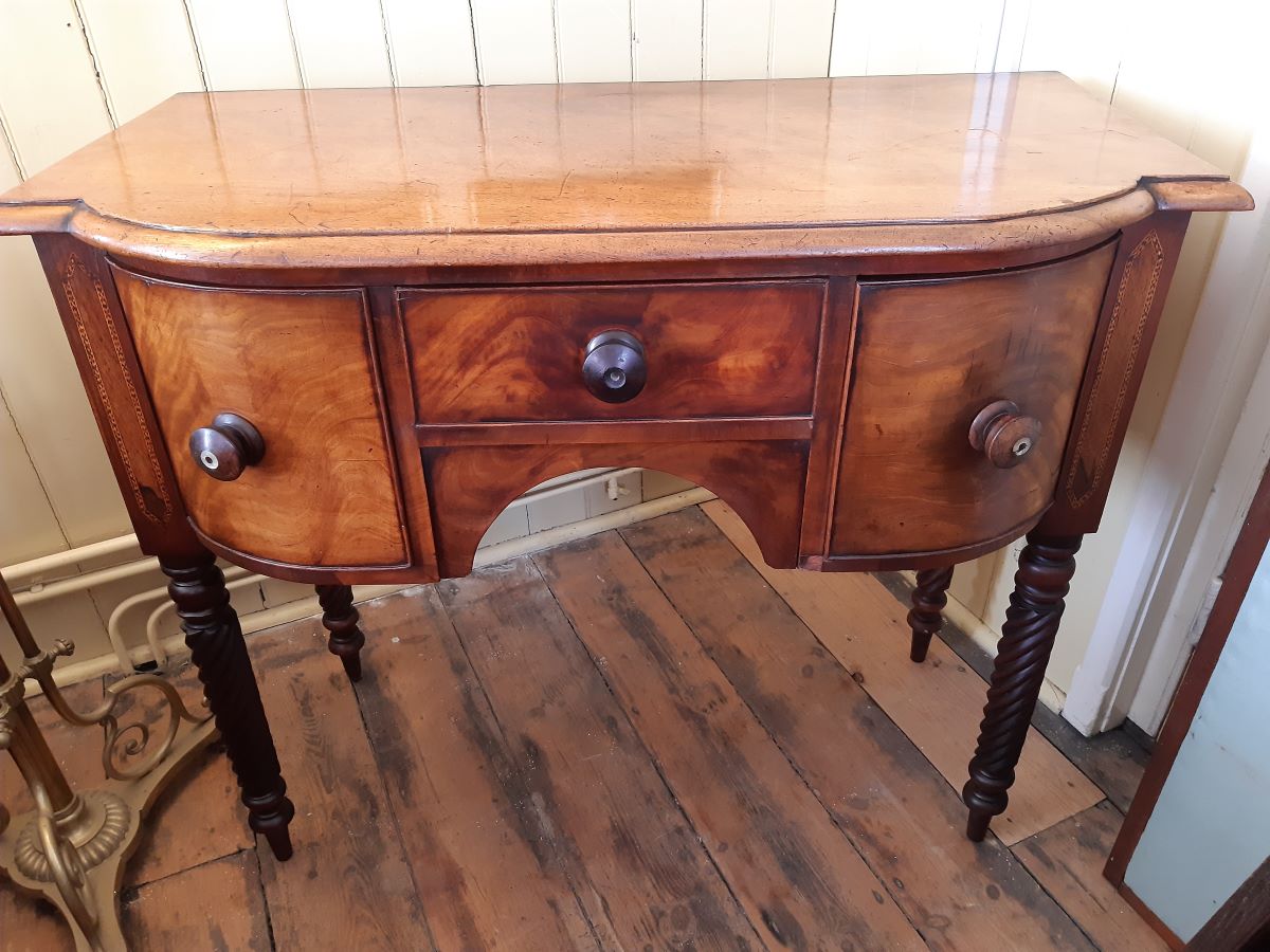 Here is a small Victorian mahogany bow-front sideboard, 3 frieze drawers with turned mahogany handles. Stands on spiral turne legs. Measures 3'4'' wide.