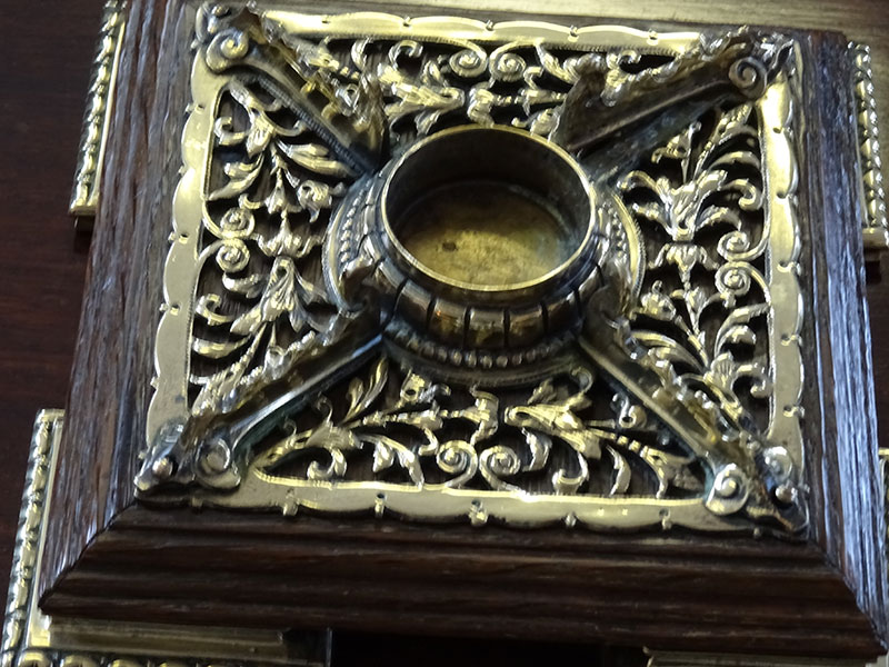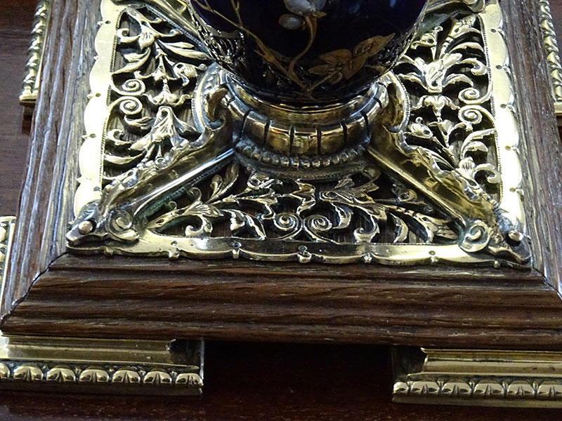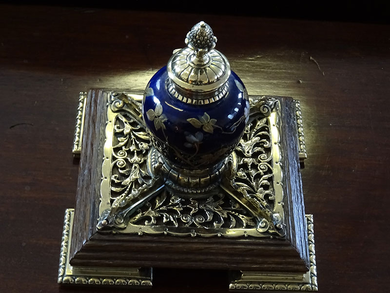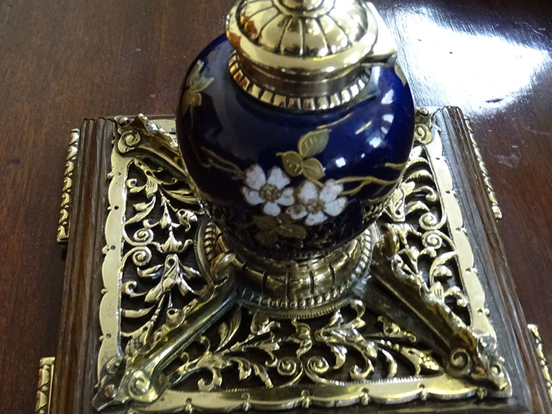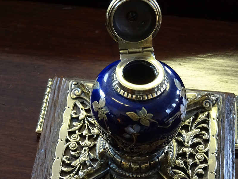 Here is a fine ceramic inkwell from the Victorian period, stands on ornate brass mounted oak base. Width 6.75 inches.