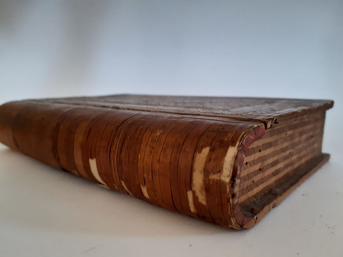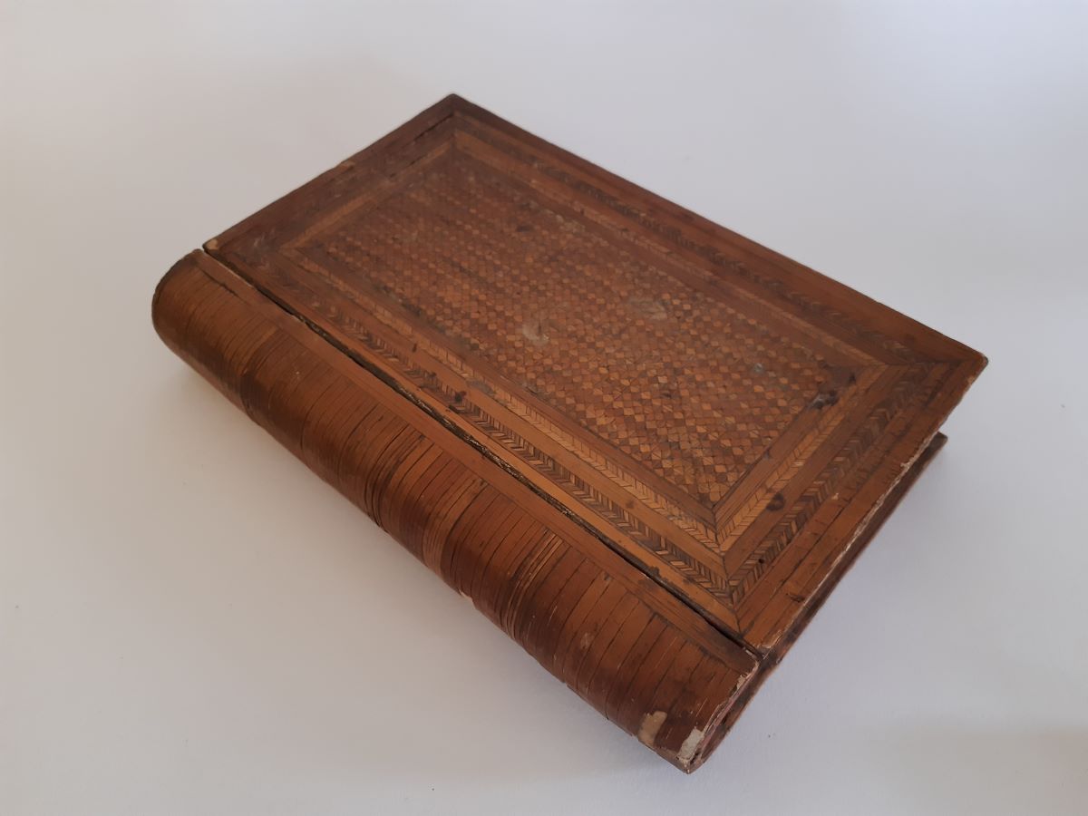 Here is a straw-work box in the form of a book, original mirror inside the lid. From the early 1800's, there is some slight damage. Measures 10'' long.