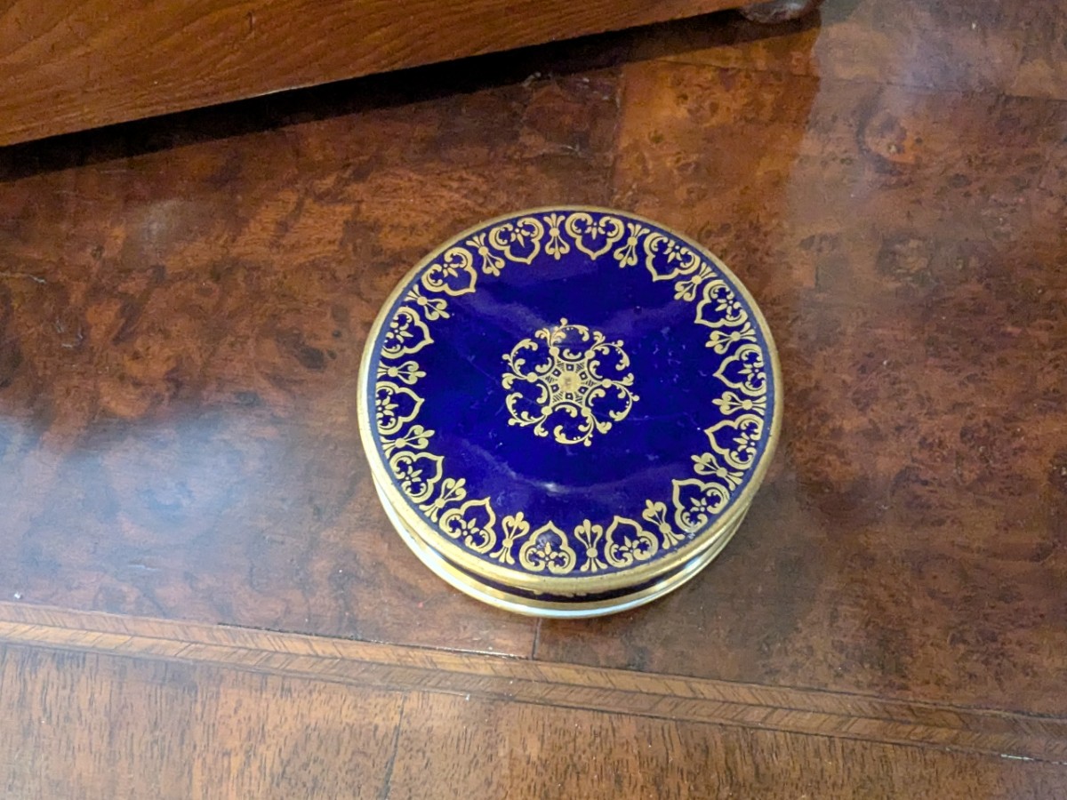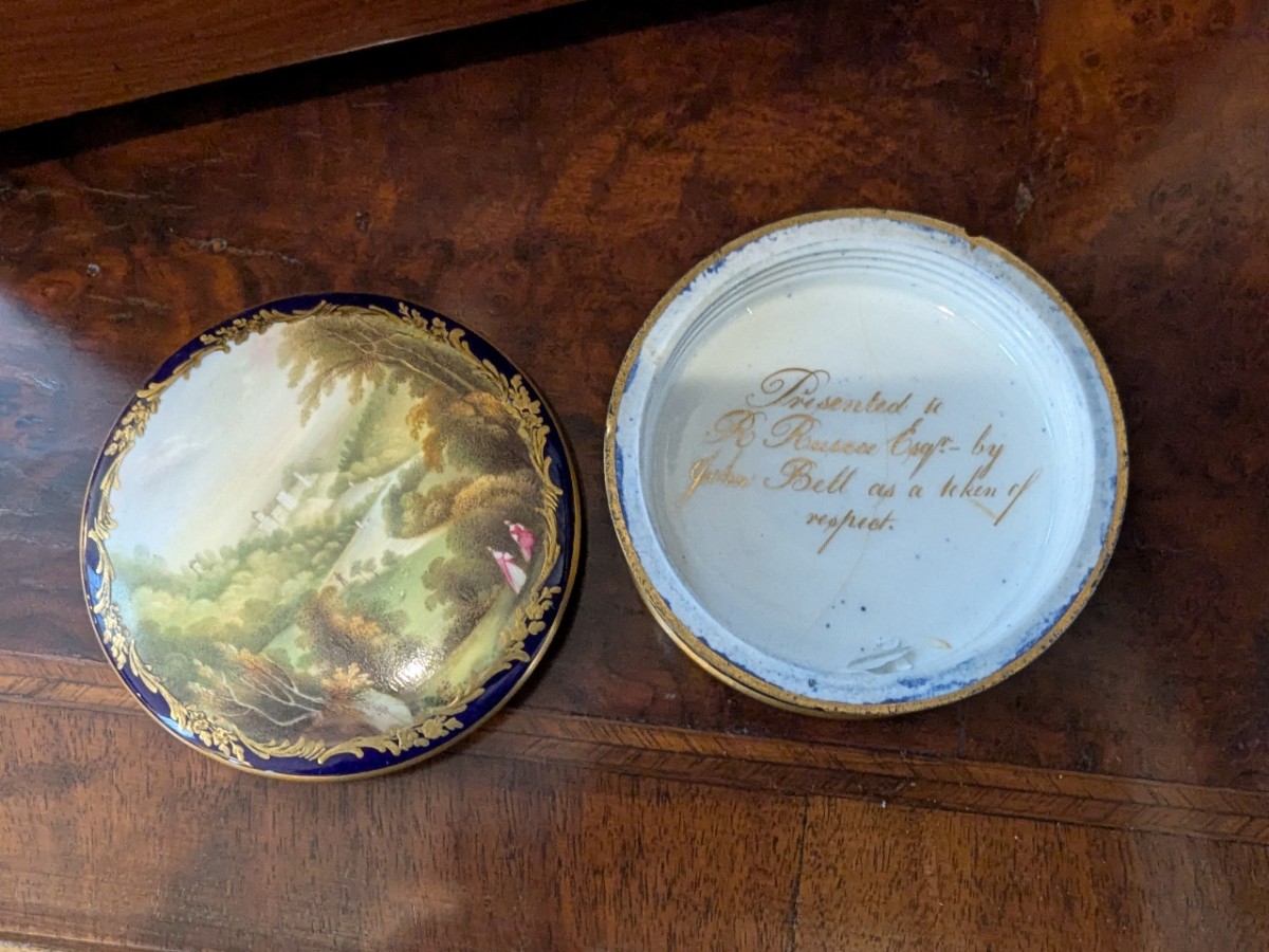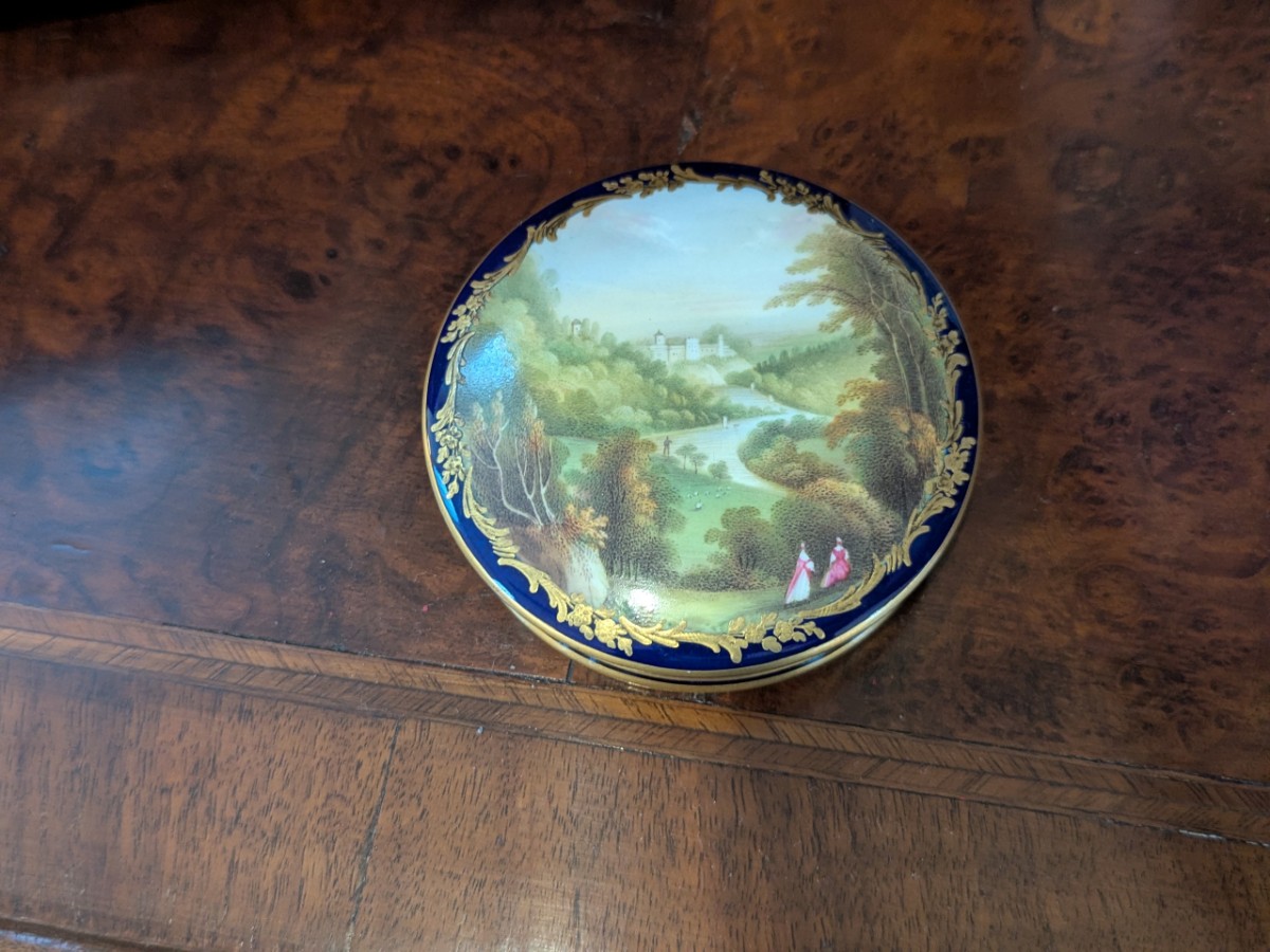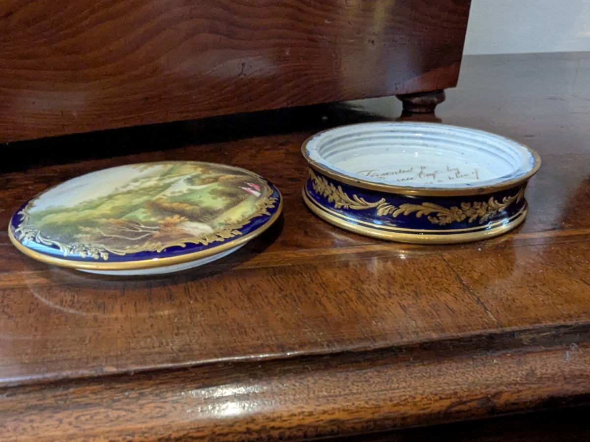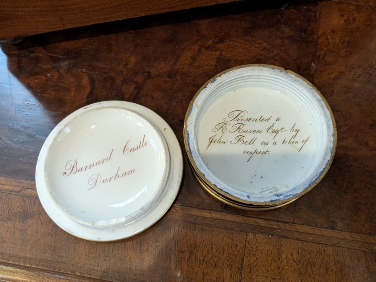 Depicting Barnard Castle, Durham. Circular box has a screw lid in blue & gilt decorated base. Slight damage inside lid. Inscription underside of lid. Personal inscription inside the box.