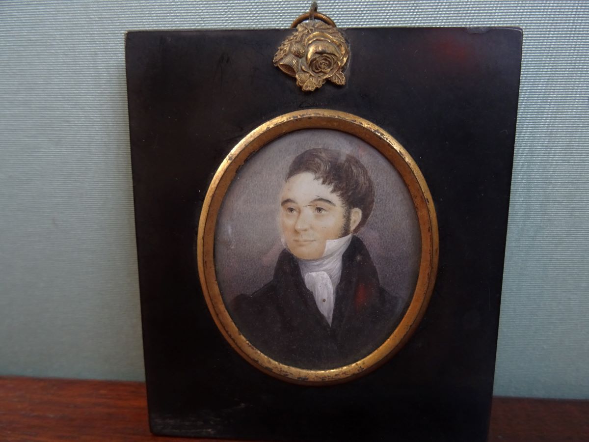 Here is a miniature watercolour of a gentleman from the 19th century, encased in an ebonized frame.