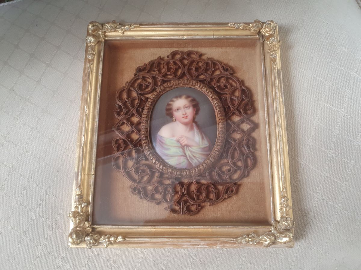 Portrait of a woman on porcelain, carved and pierced wood frame and outer gesso cabinet frame which measures 7'' x 8''.