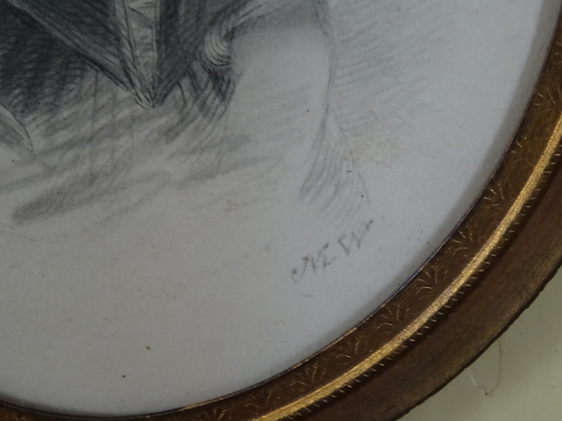 Here is a good 19th century pencil/watercolour of a young lady encased in a gilt oval frame measuring 6 inches, signed with initials.