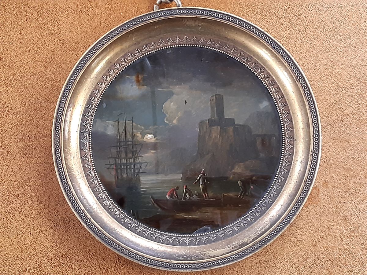 • Pair of early 19th century reverse paintings, harbour scene & classical scene