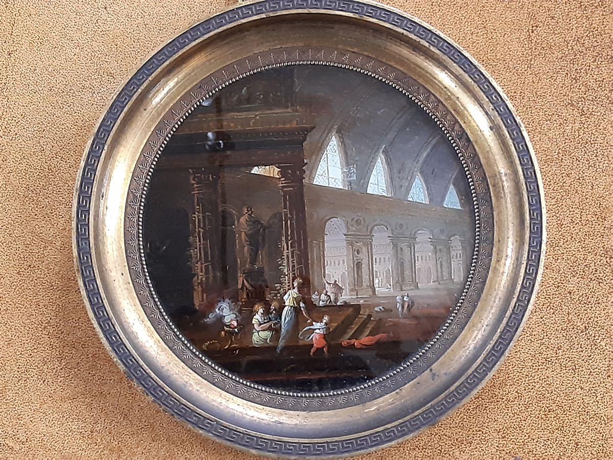Here are a fine pair of early 19th century reverse paintings behind convex glass, one depicts a moonlit harbour scene, the other a classical temple scene. Both in original gilded ormolu frames with bronze mounts. Excellent condition. Largest measures 5¼'' across.