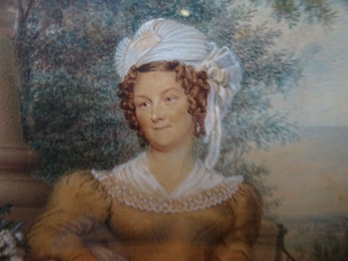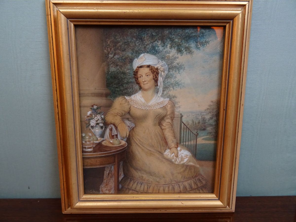 Here is a good watercolour of a seated lady, encased in a gilt wooden frame. Measures 13''x 11''.