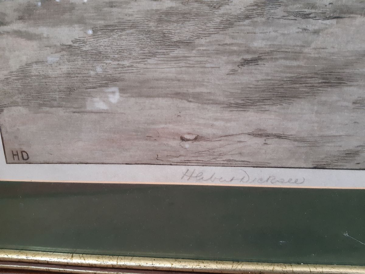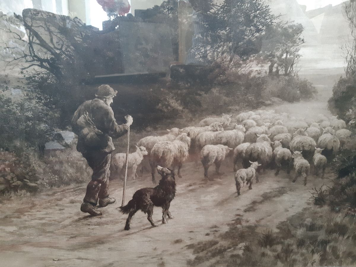 Here is an engraving of a shepherd and dog moving his sheep along a country lane. Signed in pencil. Measures 33'' x 28''.