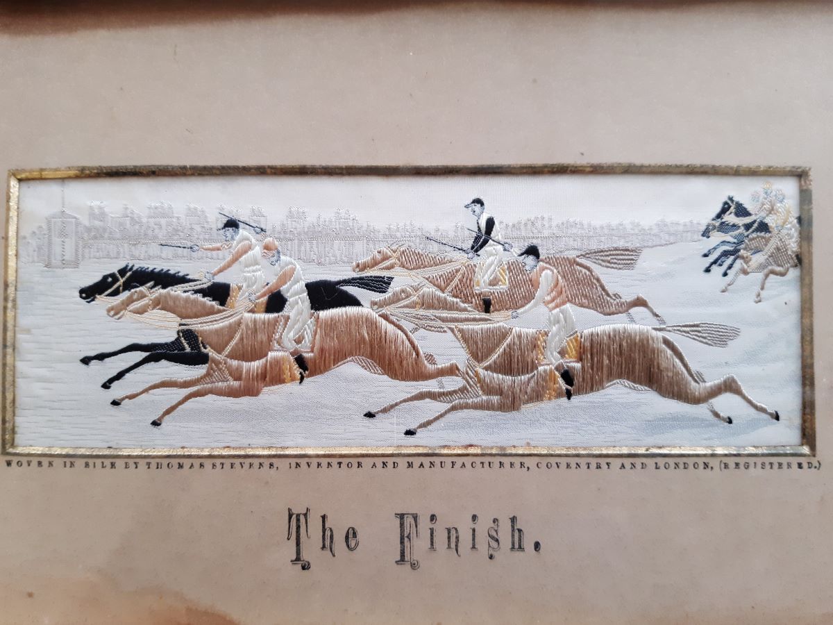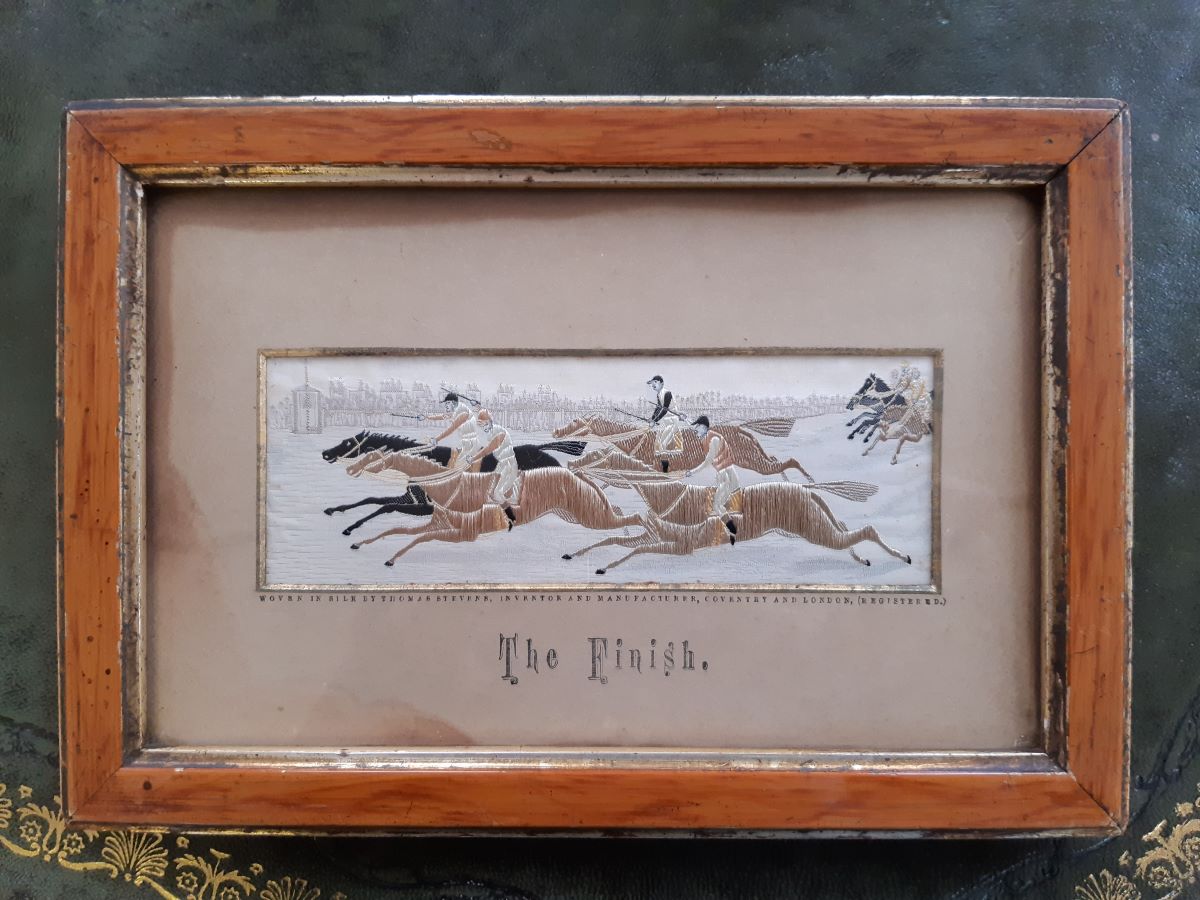 • Pair 19th century silk work, Stevengraphs, horse riding.