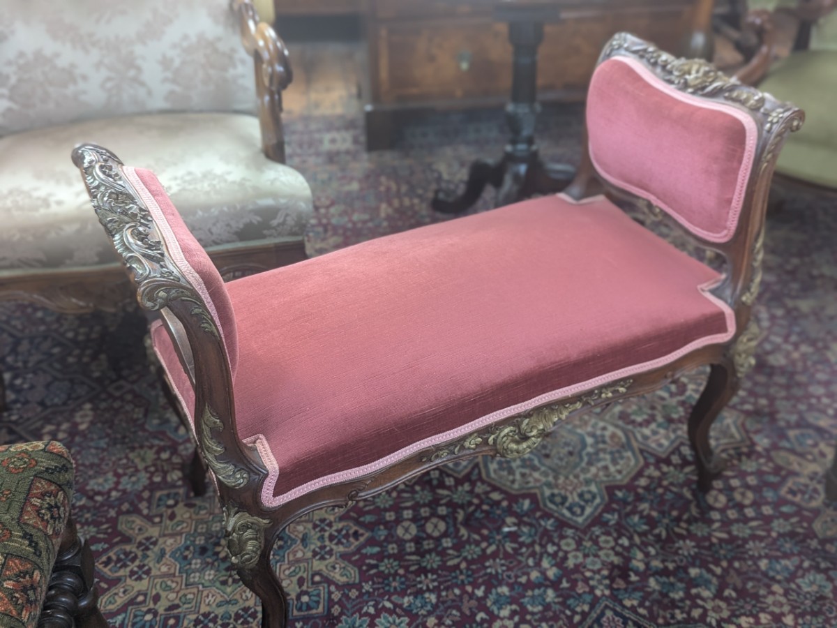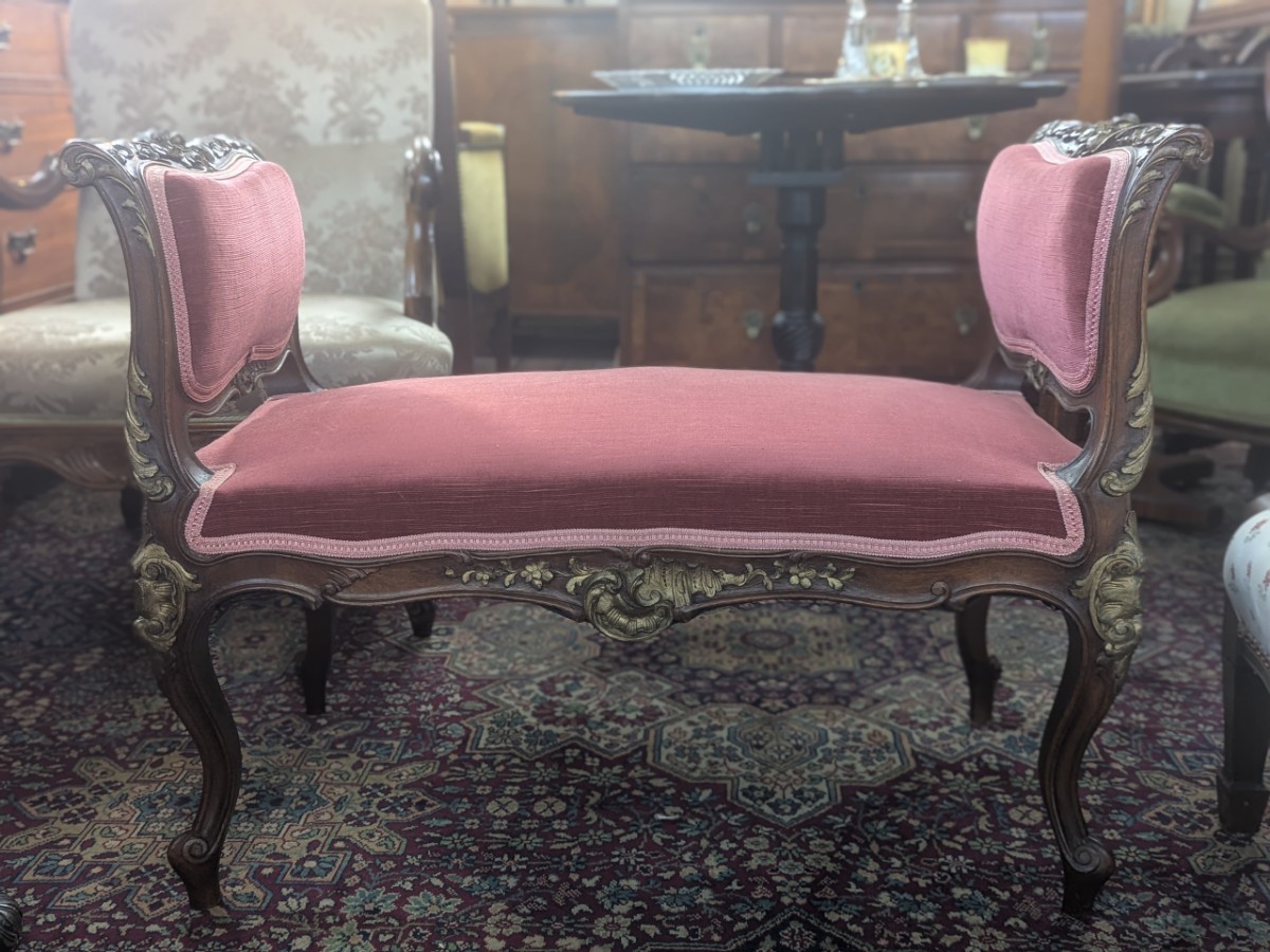 Scroll arms and carved cabriole legs. Length 35'', Depth 17''.