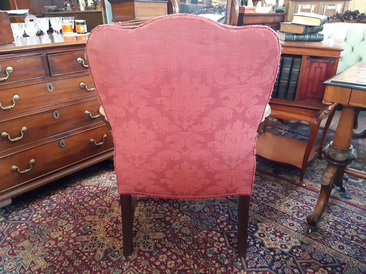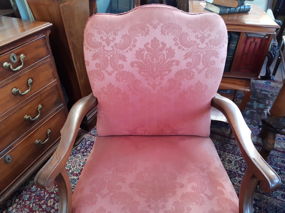Here is a mahogany easy chair in the Gainsborough style with light red damask upholstery. Measurements: Height of back-36½'', Depth-24'', Seat depth 20'', Seat height 17''.