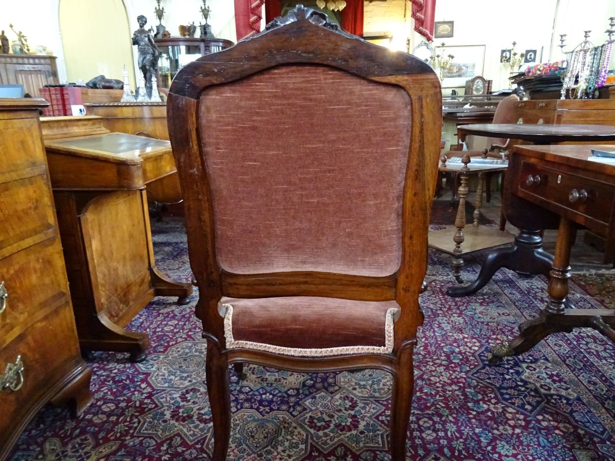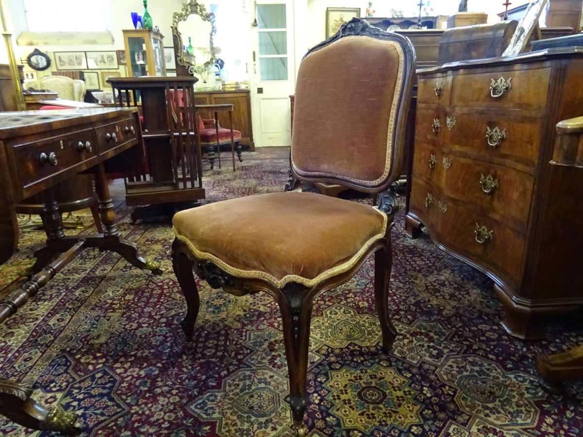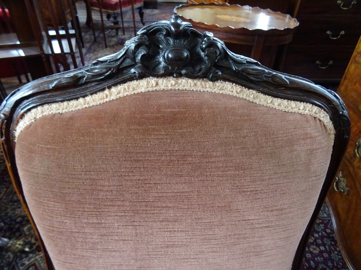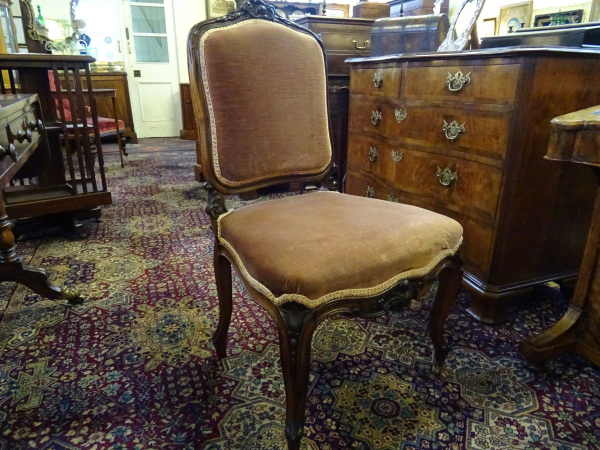 Here are a pair of 19th century rosewood framed side chairs, carved and shaped show wood, standing on cabriole legs. Upholstery good.