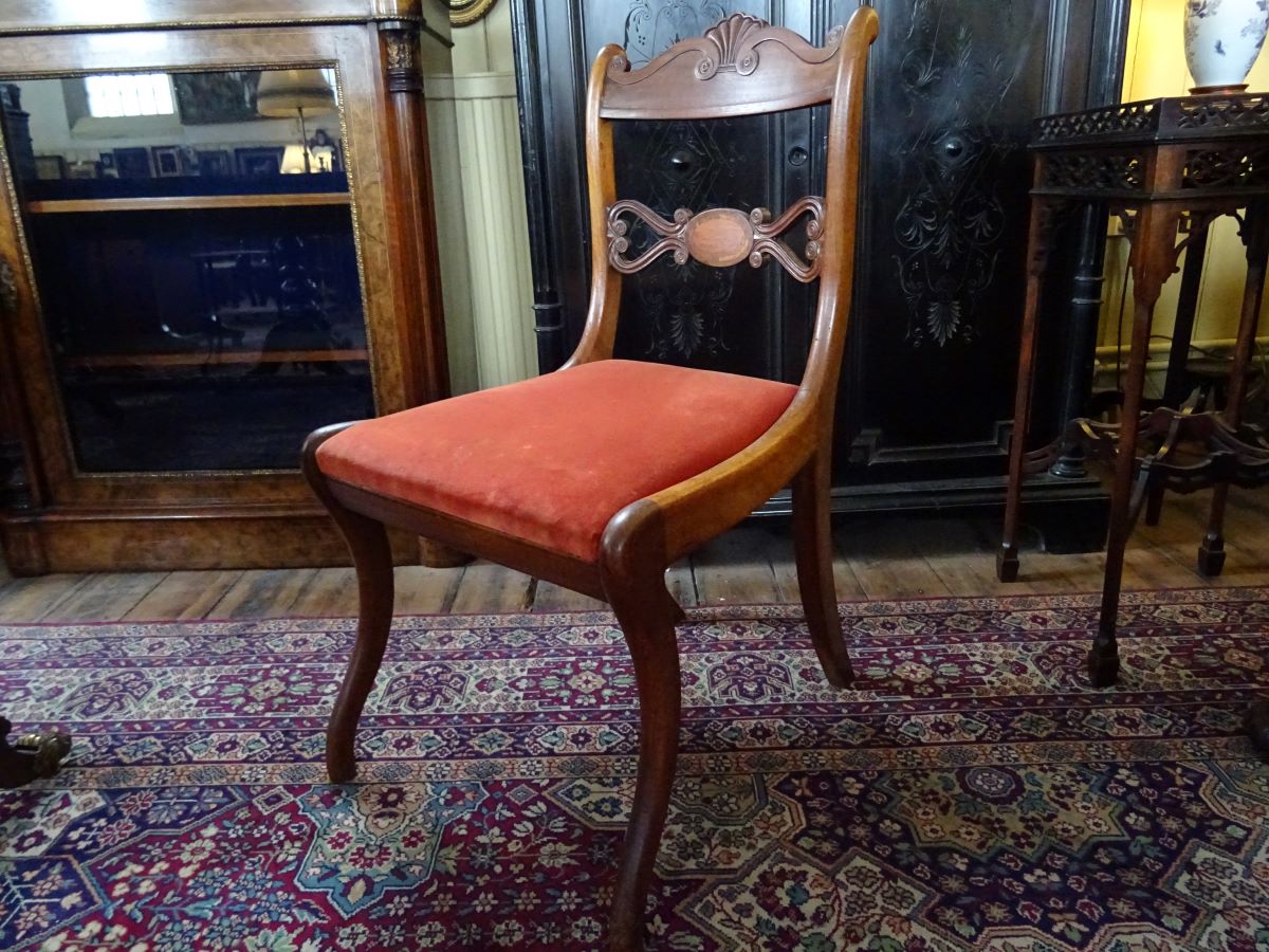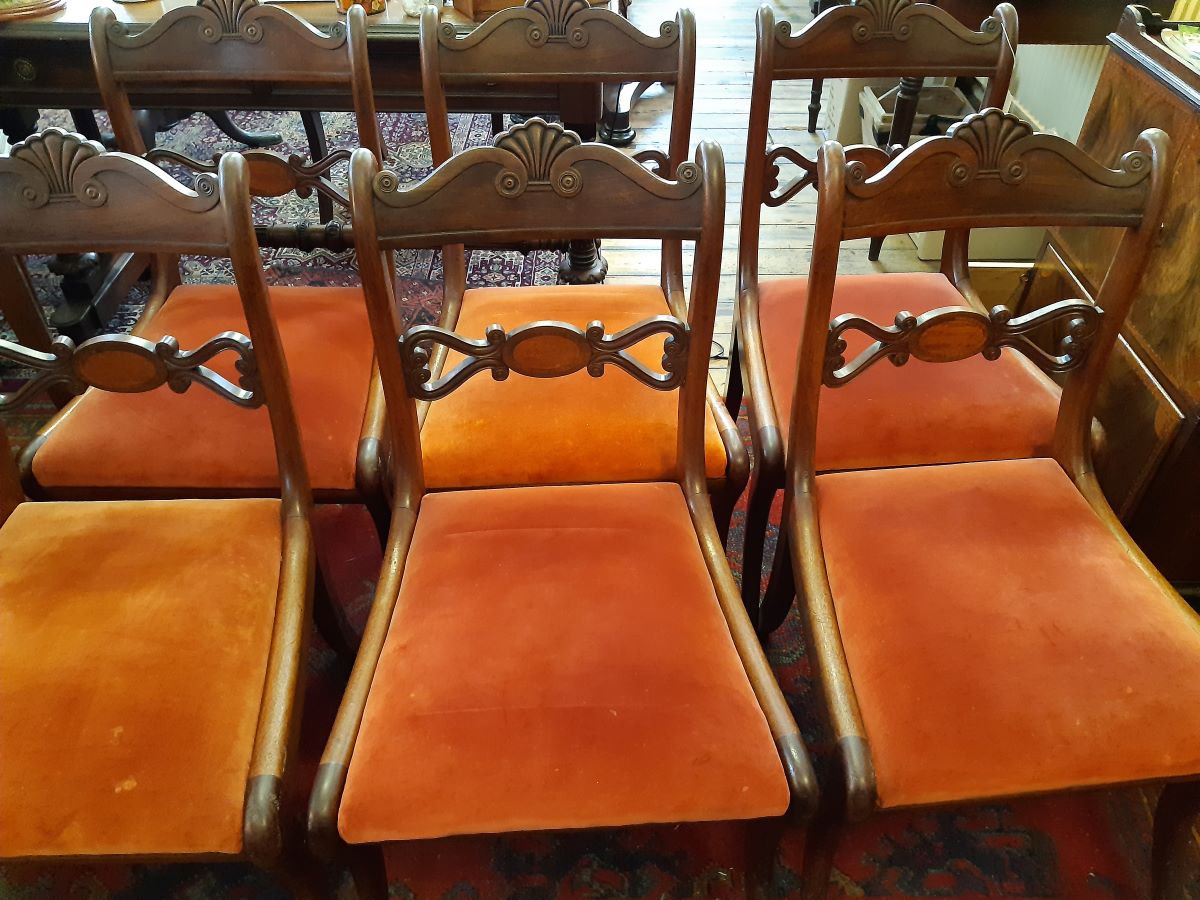 Here are a set of 6 dining chairs from the William IV period, standing on sabre legs, drop in seats.