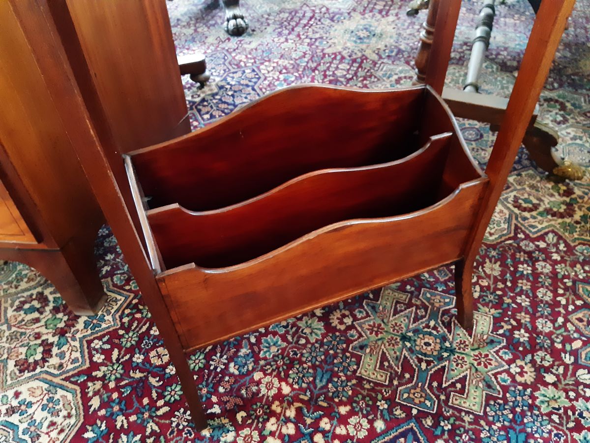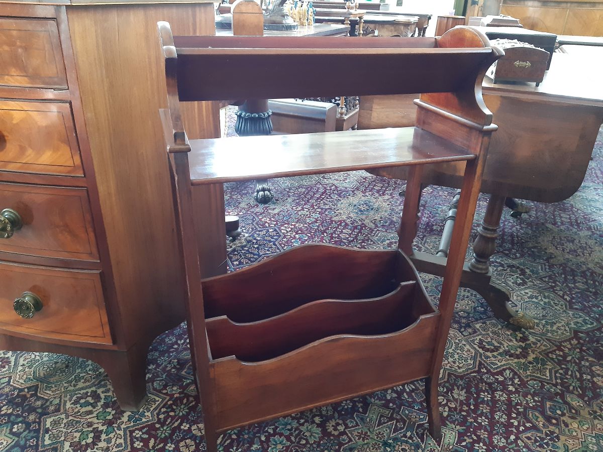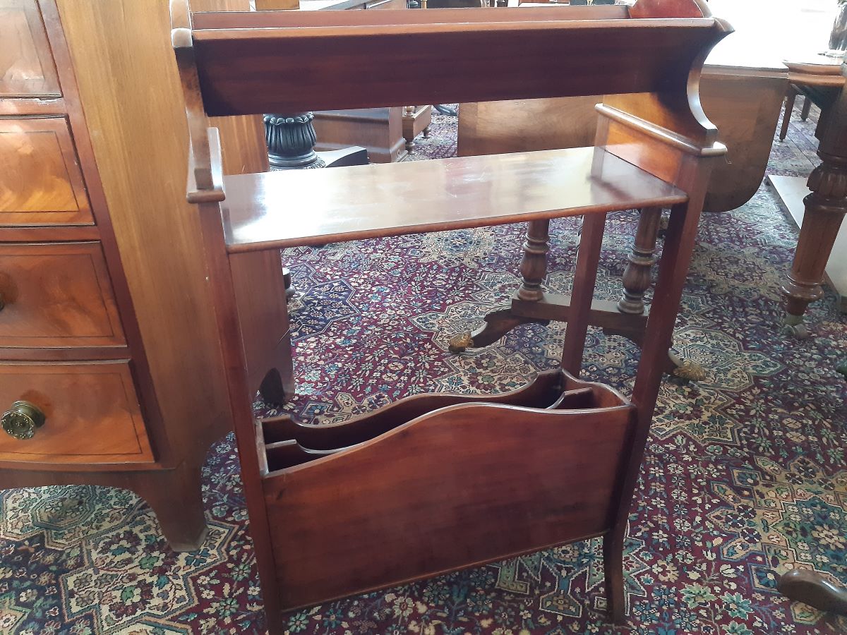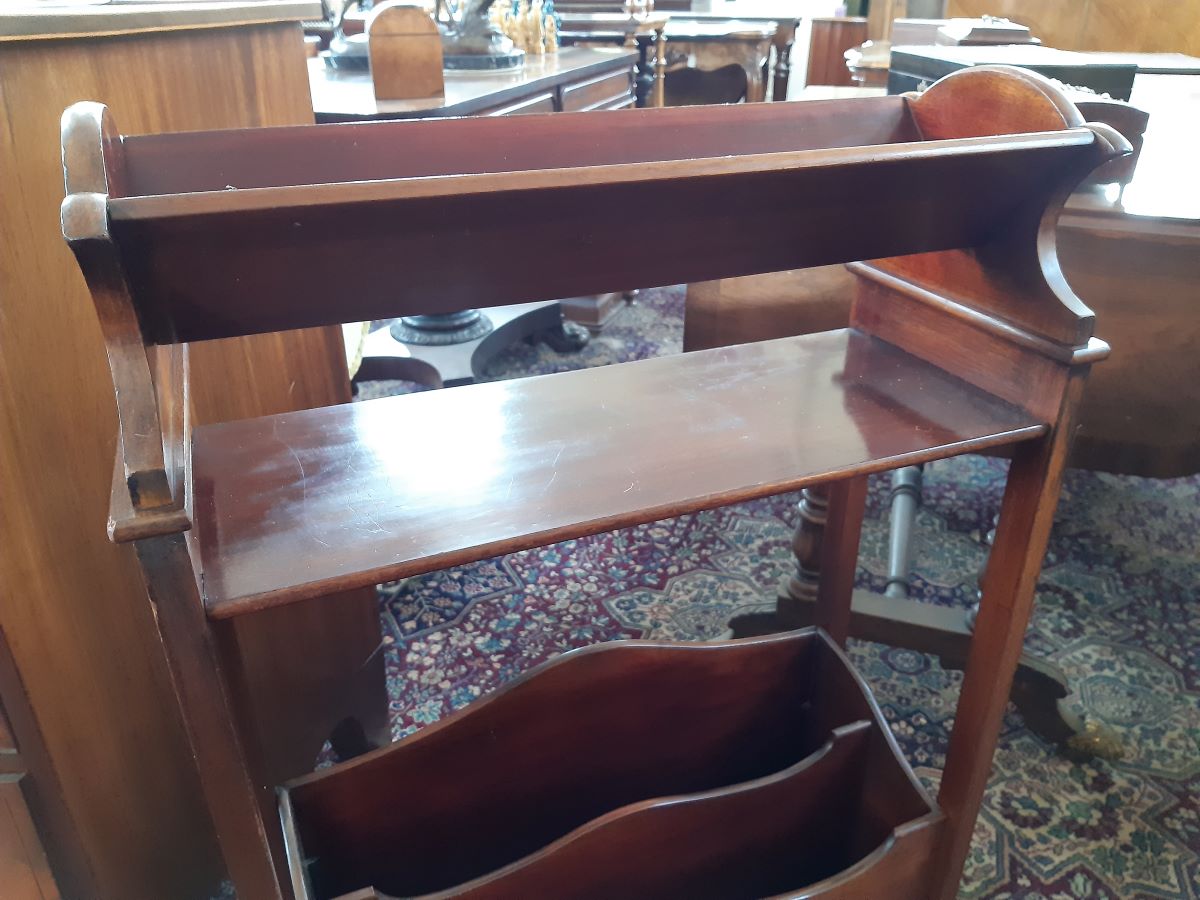 Here is a book rack with magazine rack under, made from mahogany it stands 34'' high, 21'' wide, 9'' deep.
