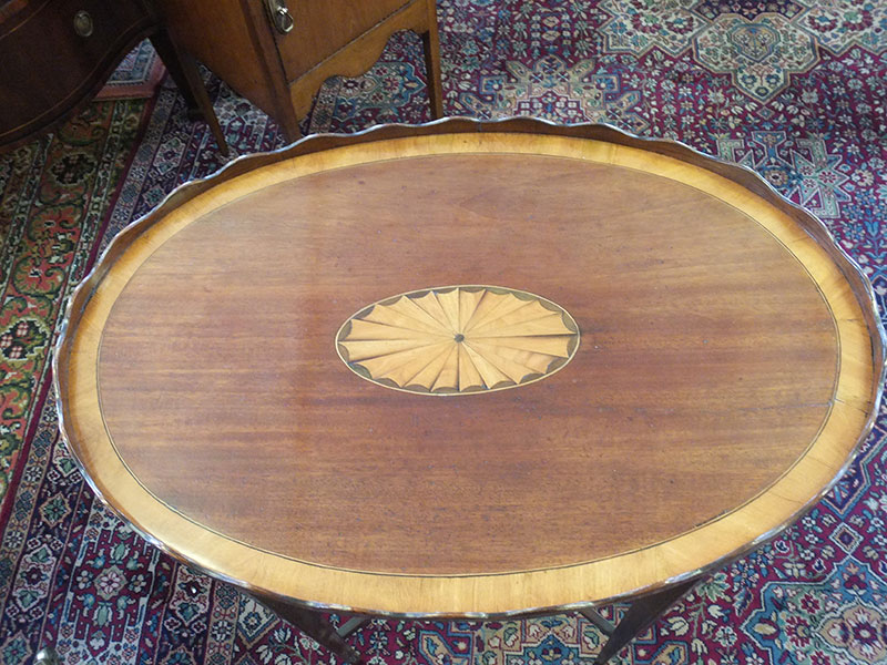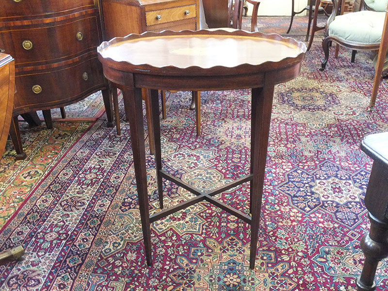 Here is a 19th century mahogany oval occasional table. Satinwood banded and inlaid with patterae, with wavy edge border on four tapered strung legs with x cross stretcher. Measures 24 inches by 16 inches, 29 inches high. Excellent condition.