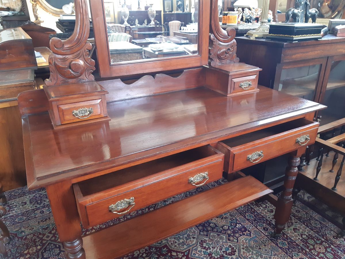 Here is a walnut dressing table, with adjustable mirror above 2 jewellery drawers, which sits above 2 drawer top. Shelf under. Good condition. C.1890's. Measures 41'' x 19'' deep.