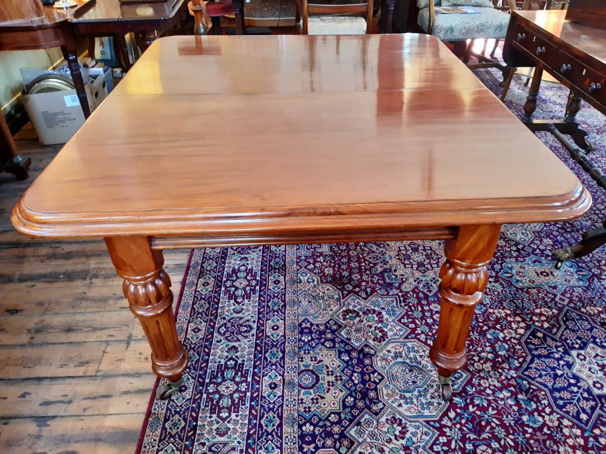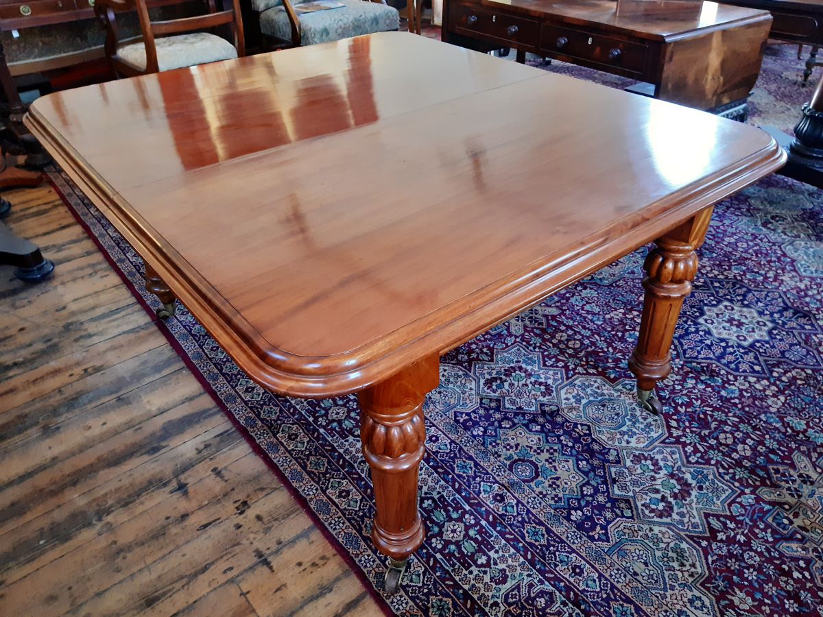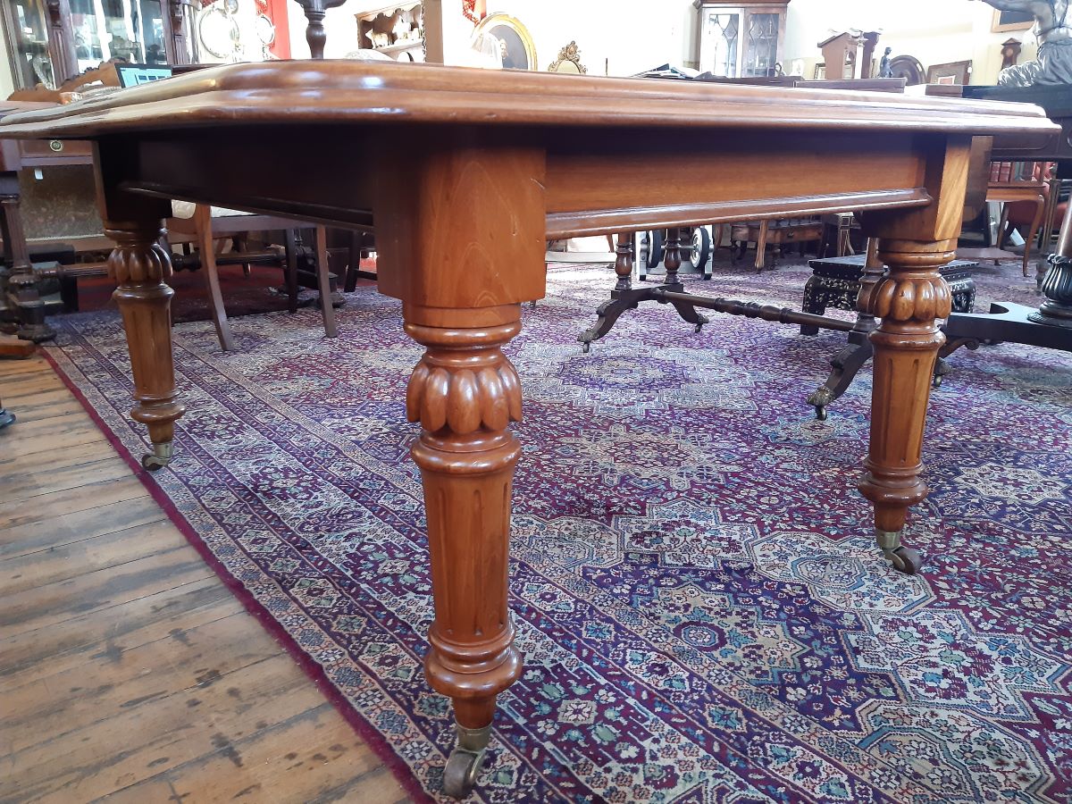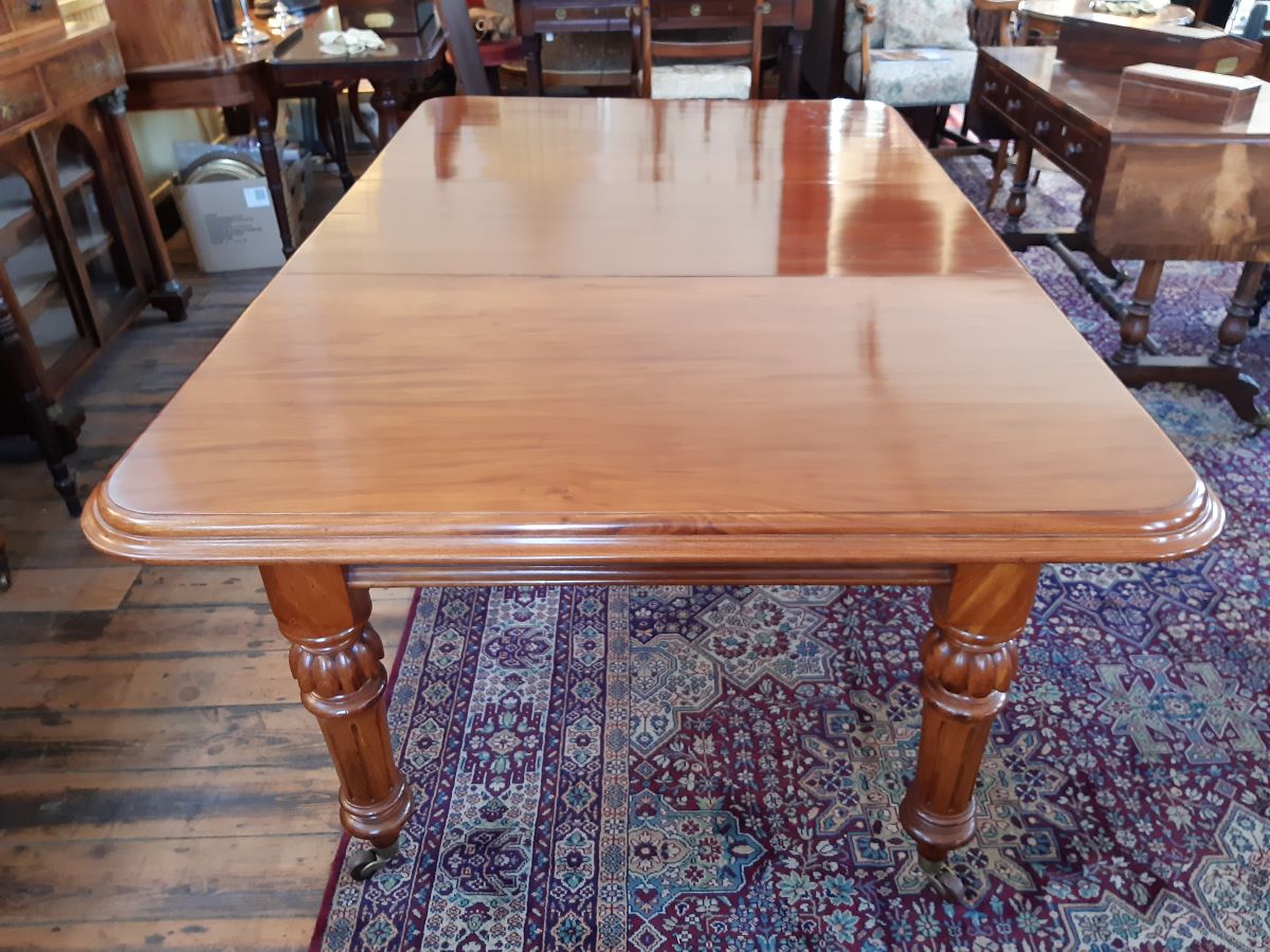 Here is a good mahogany wind-out dining table, spare leaf, with carved & turned legs. Good condition, measures 3'11'' wide x 4'6'', extending to 6'.