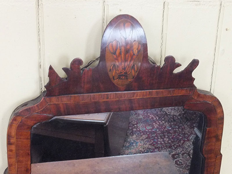 Here is an early 18th. century walnut mirror, frame crossbanded. The shaped mirror with crest piece with oval marquetry panel with Prince of Wales feathers. Quite an old replacement mirror. Reasonable condition, measuring 19.5 inches wide by 24 inches high.