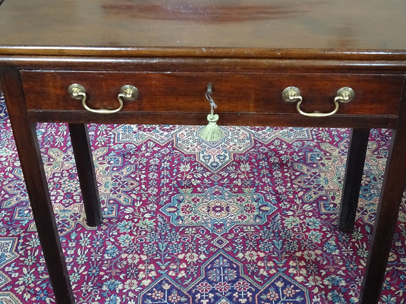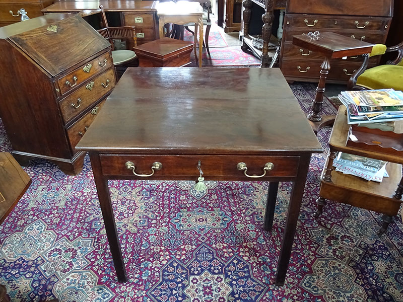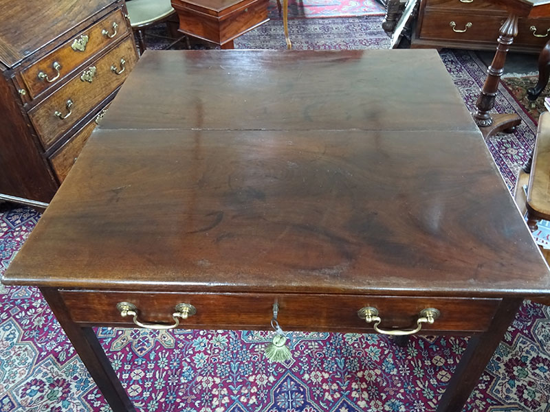 Here is a good George 111 tea table made from a deep red figured mahogany, the foldover top sits on a gateleg action. Fitted drawer has two original brass handles. Measures 33 inches wide, 16.5 inches deep and 30 inches high. When fully open measure 33 inches deep. Amazing condition, made around 1770.