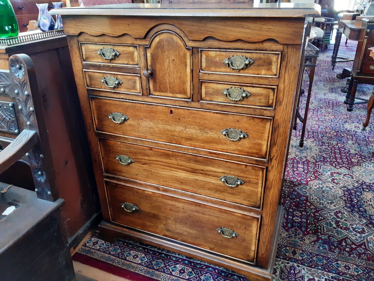 Here is a good quality oak chest, 3 long drawers and 4 small drawers with a small frieze cupboard. Measures 33'' wide, height 3'6'', 41''high.