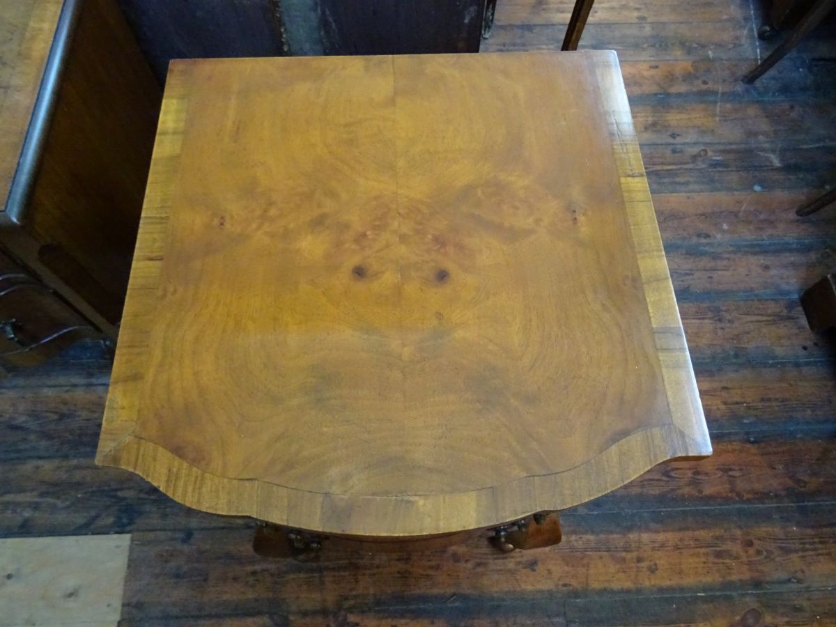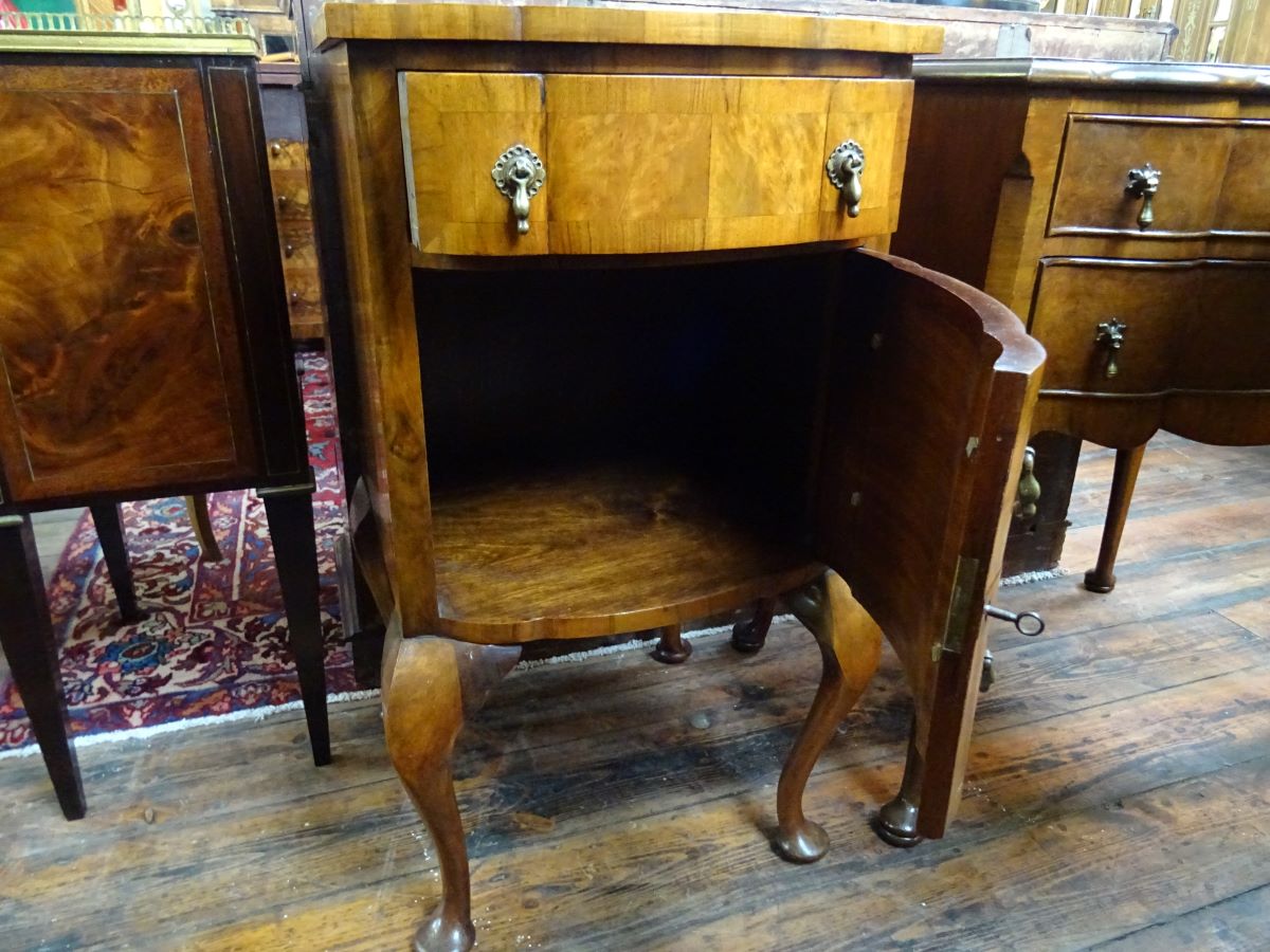 Here is a small cupboard, shaped cross banded burr walnut top, under which is a drawer with dummy drawer cupboard fitted with drop brass handles. Stands on cabriole legs. Measures 16'' deep and 29'' high and in excellent condition.