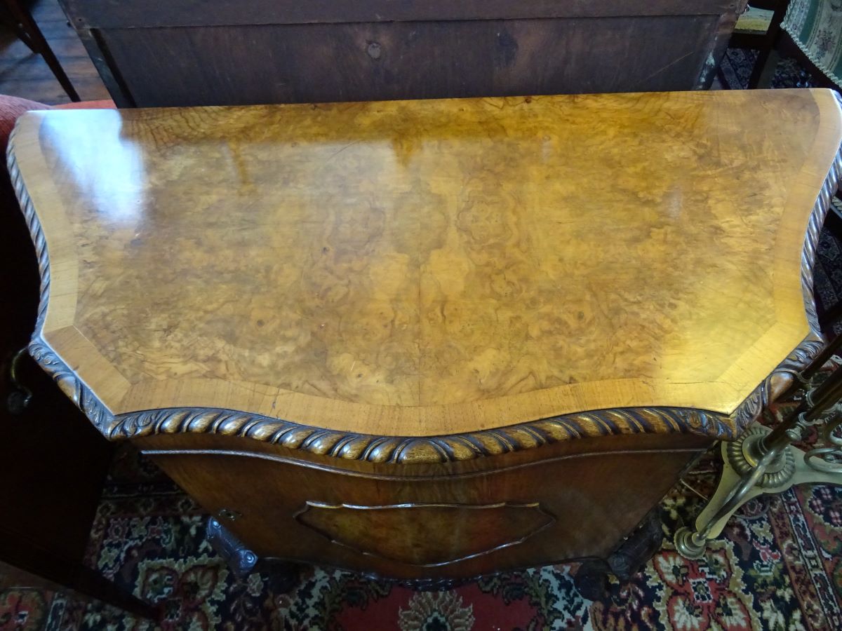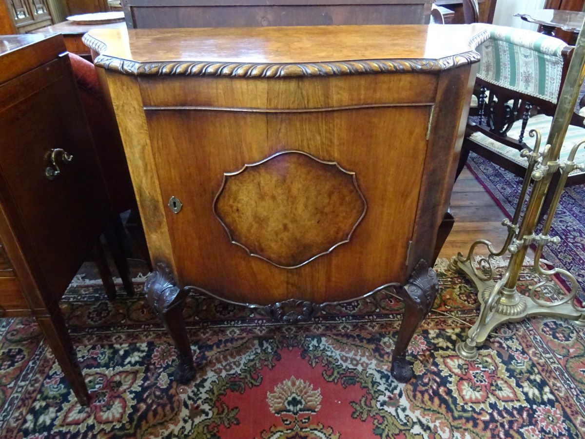 Here is a good quality walnut cabinet. The shaped top is burr walnut with cross banding and gadroon. The door opens to reveal a shelf. The cabinet stands on carved cabriole legs. Measures 30'' wide, 12'' deep, 34'' high. Excellent condition.