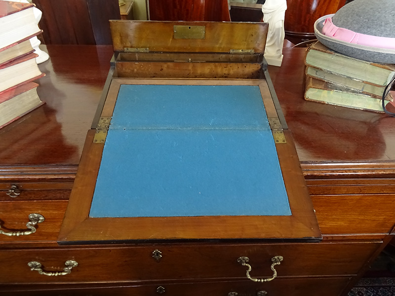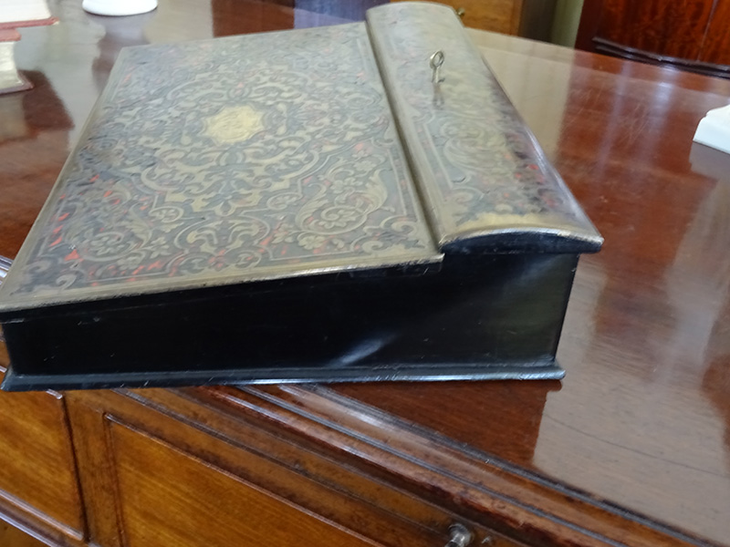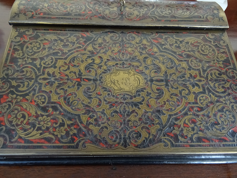 Here is a fine French 19th. century boulle work writing slope, top opens to reveal original baize writing slope. Retailers label under base.