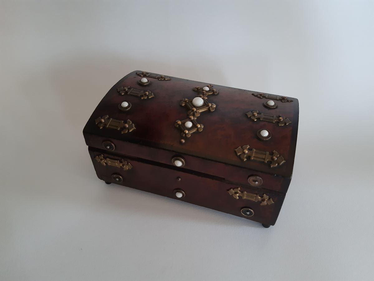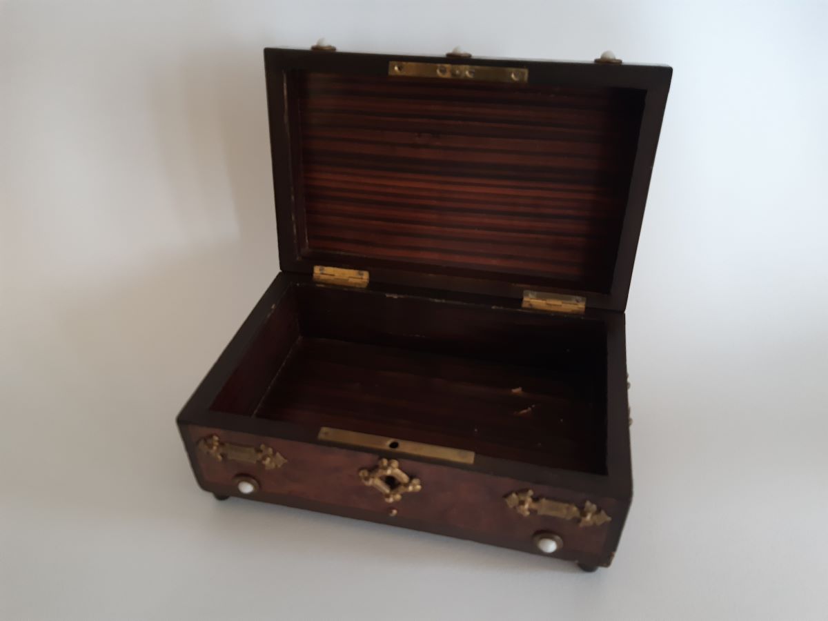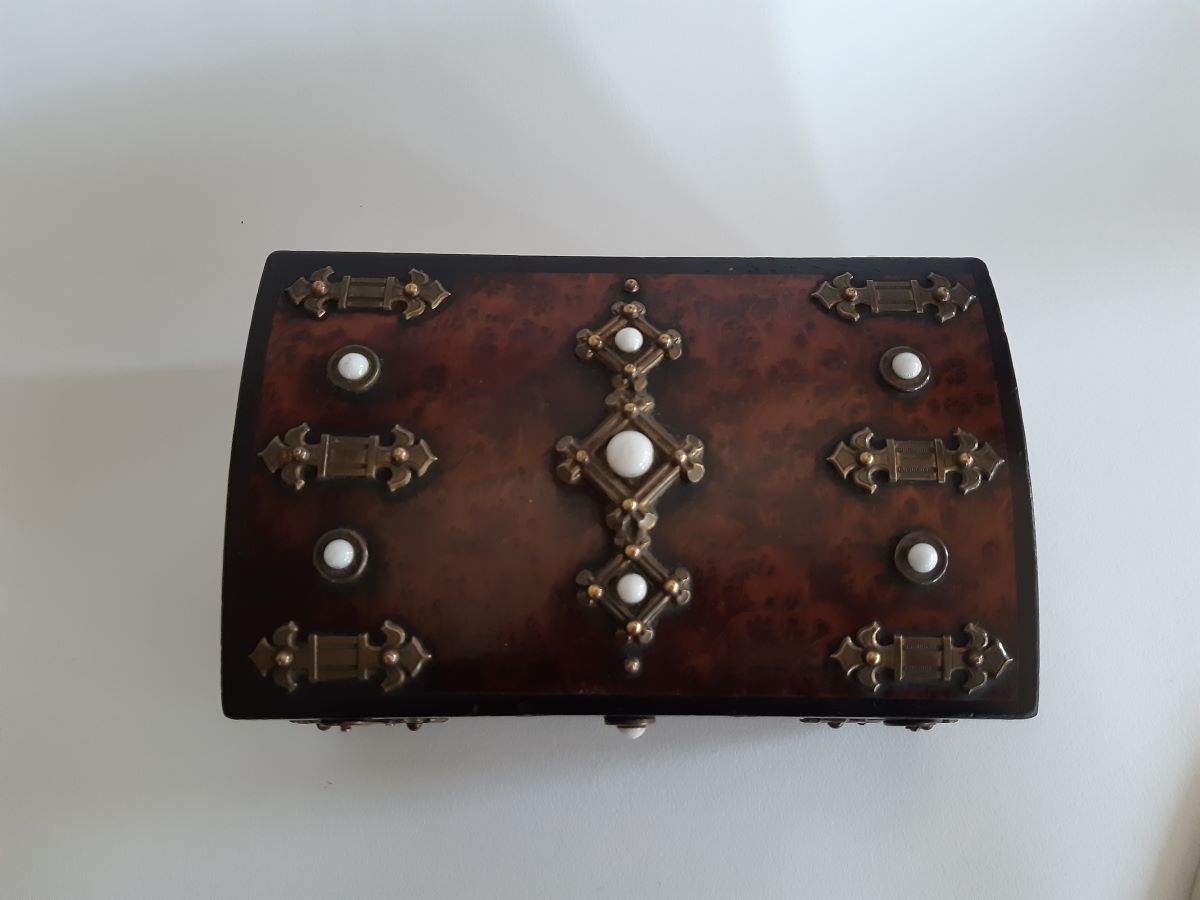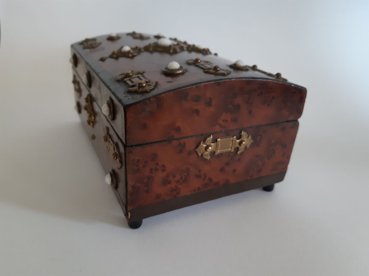 Here is a good quality French dome-top jewel box, made from amboyna with brass mounts and inset with milk glass jewels. Measures 8'' long.