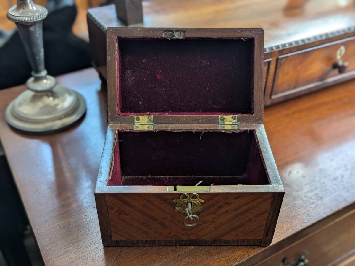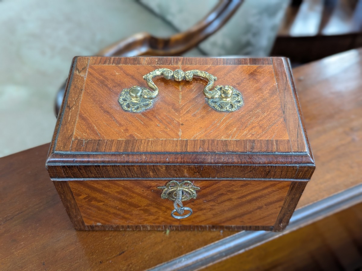 With ormolu carrying handle and key. Width 7½'' Height 10''.