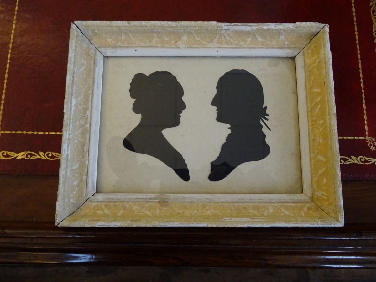 Hand painted silhouette of a lady and gentleman encased in a cream frame measuring 8.2'' x 7''.