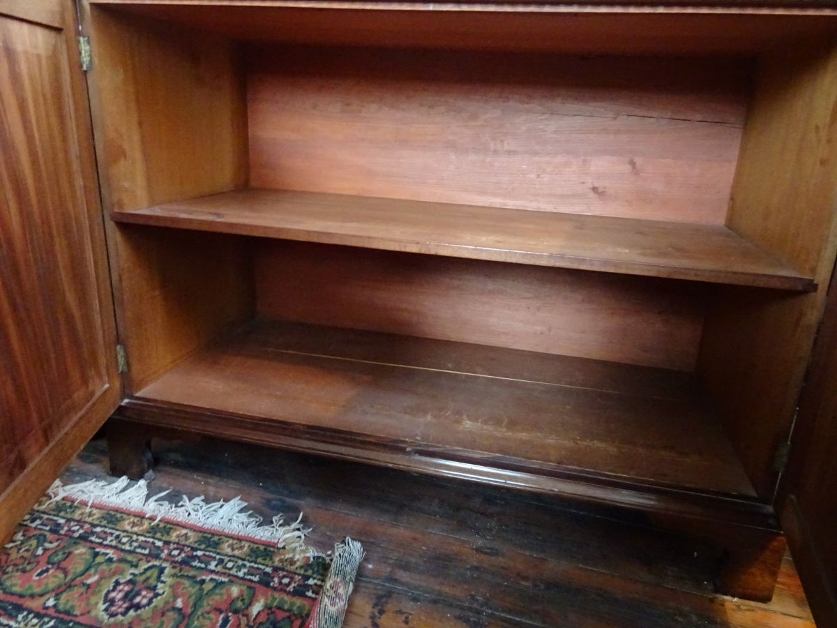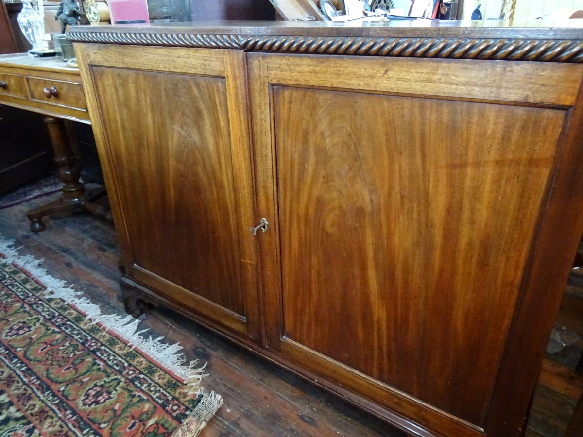 Here is a mahogany cabinet with carved edge, 2 panelled doors, stands on bracket feet. Good condition and measures 3'8'' wide, 2'9'' high, 1'8'' deep.