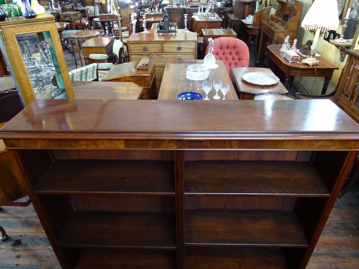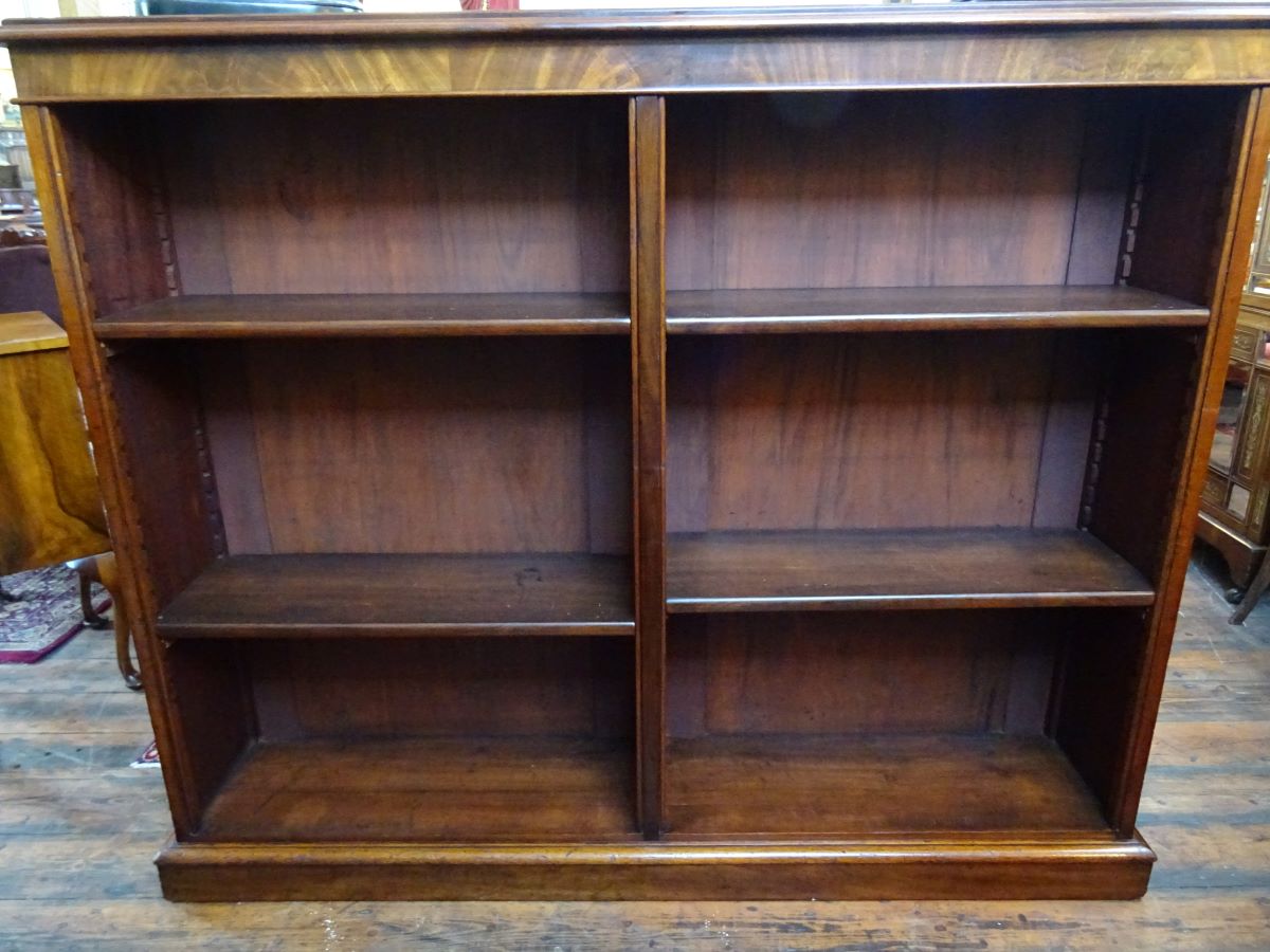 Here is a mahogany, double fronted open bookcase, with adjustable shelves. Good condition. Measurments: Height: 3ft 10'' Wide: 56'' Depth: 12''