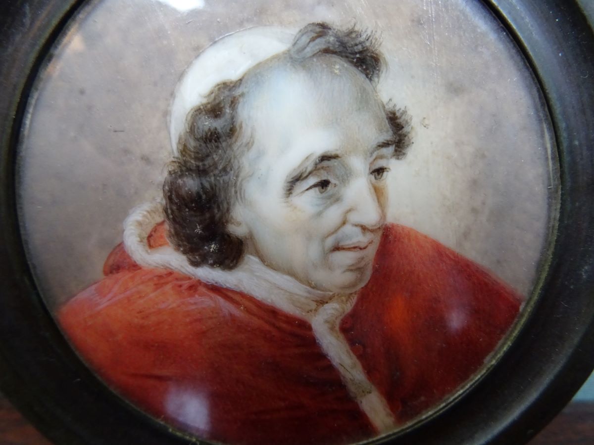 Here is a miniature watercolour portrait of a cardinal encased in a metal frame from the 19th century.