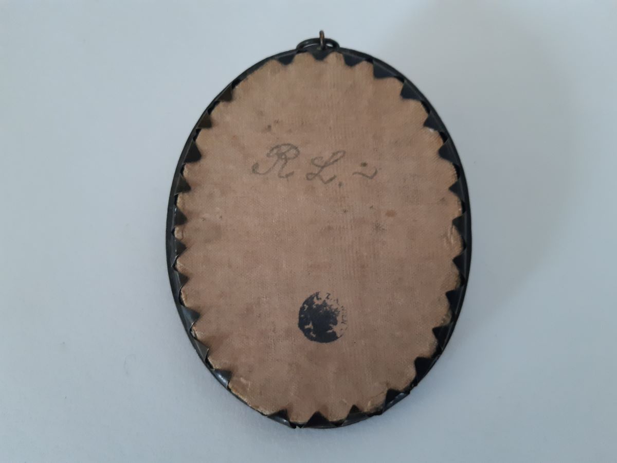 Here is a miniature watercolour, head and shoulders on ivory of a woman, signed with monogram. From the early 19th century, in original brass frame. Measures 3½''.