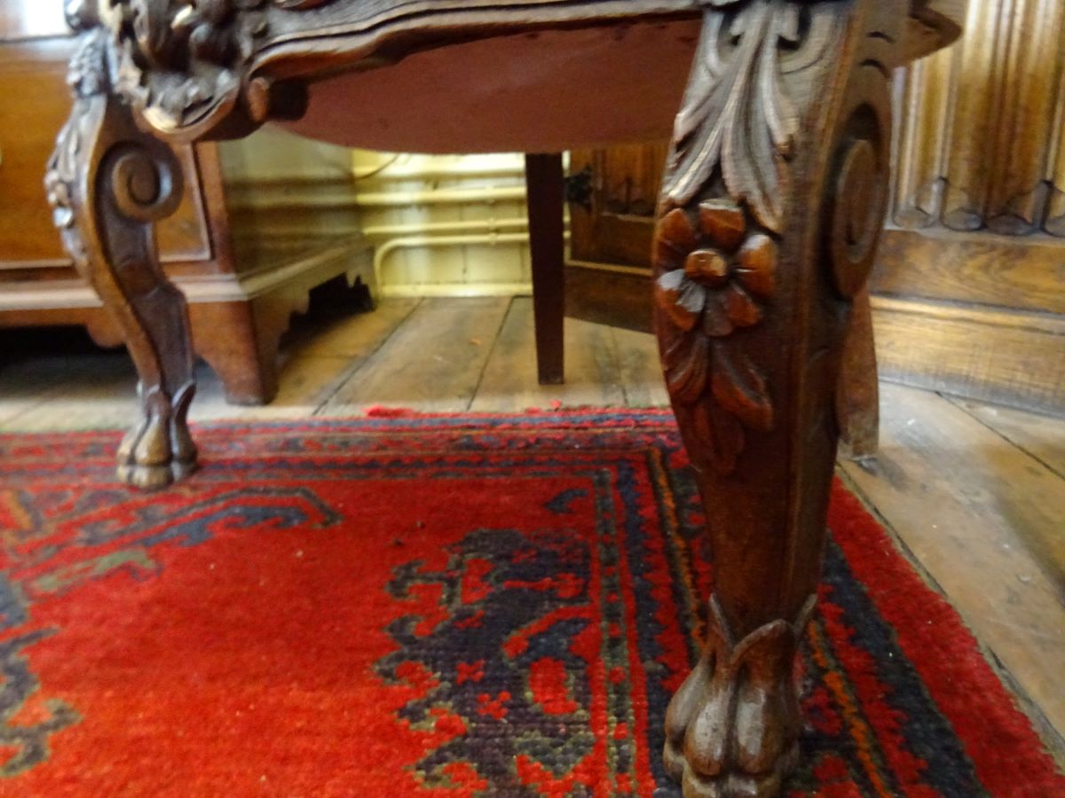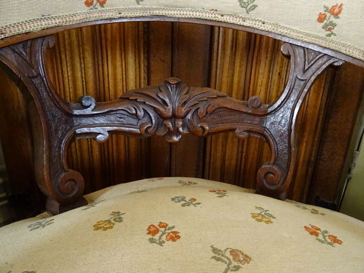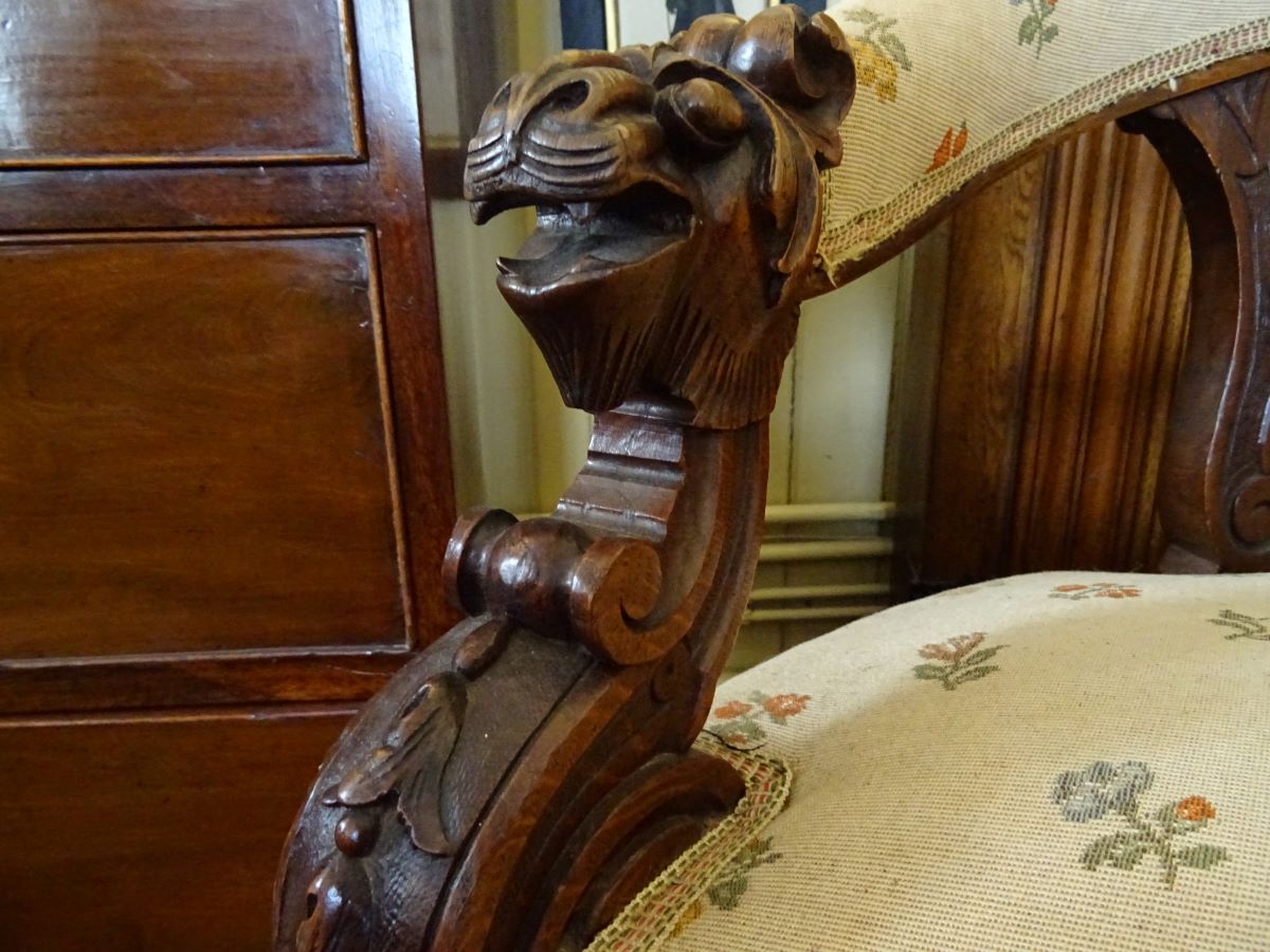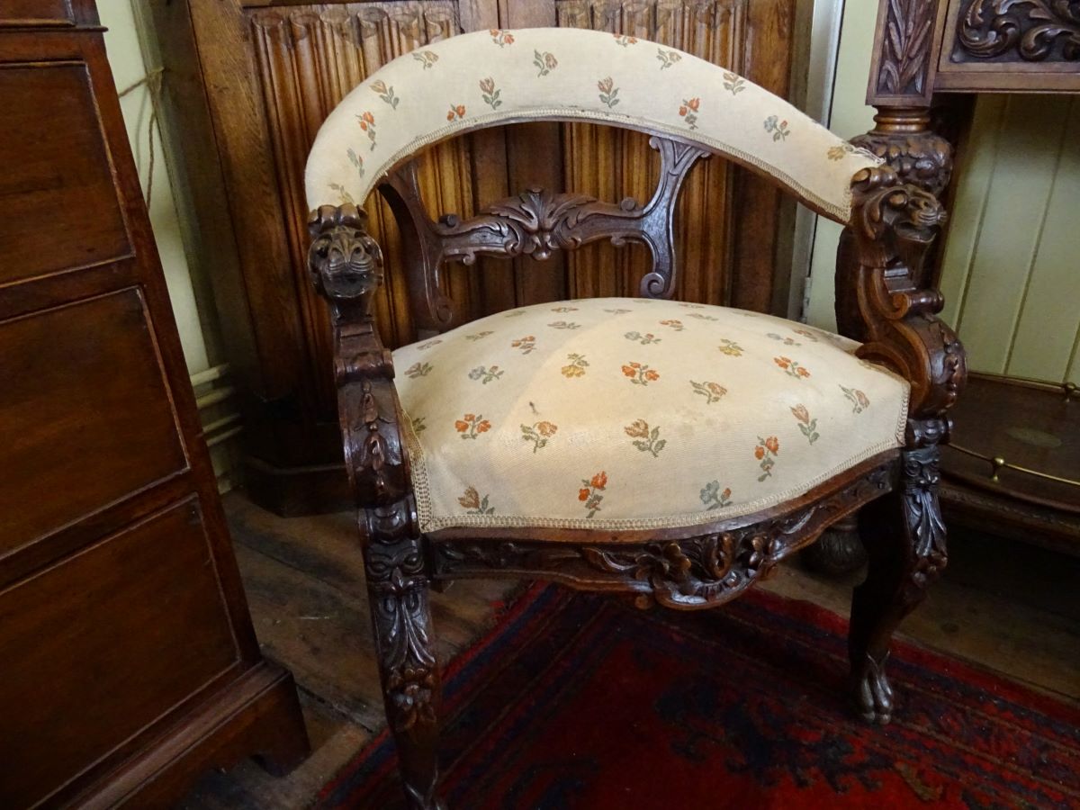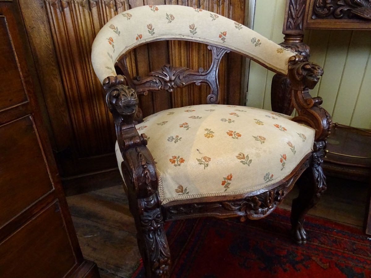 Here is a nicely carved oak framed bow back armchair with griffin supports. Upholstery is in reasonable condition.