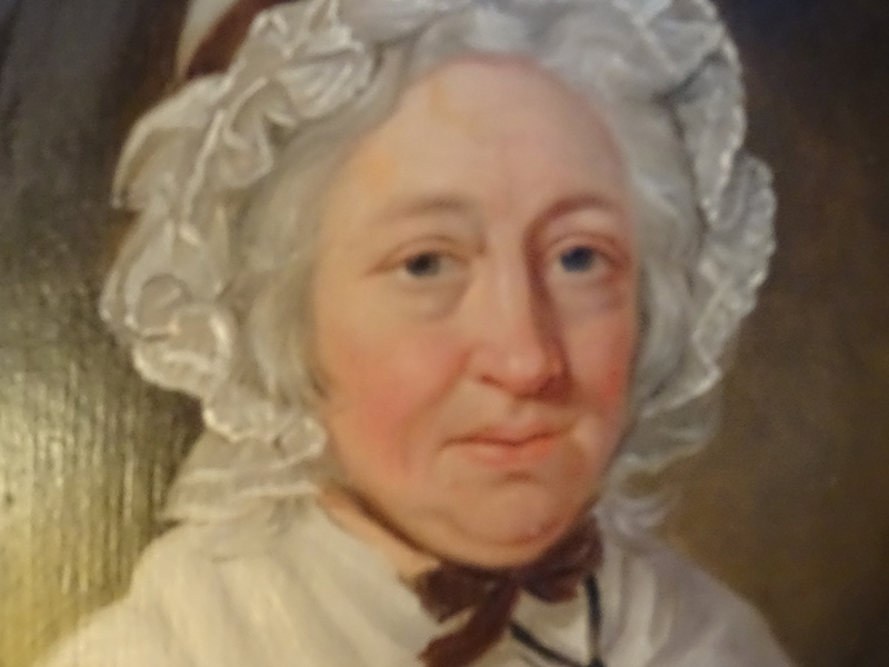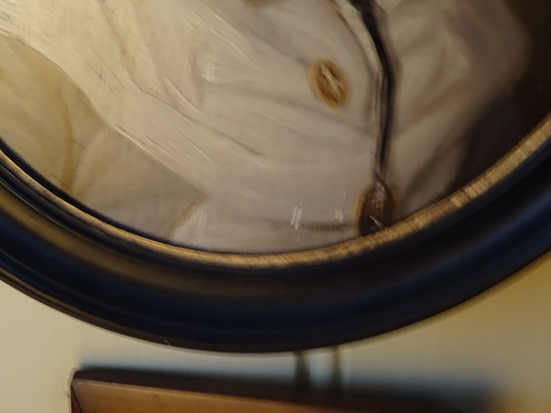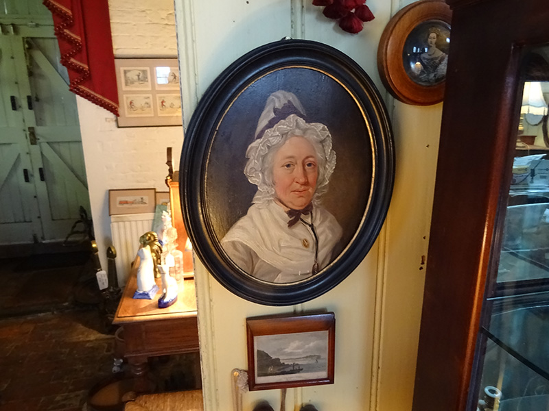 Here is a portrait of a woman, painted with oils on wood, early 19th. century, encased in an ebonized oval frame which measures 12.25 inches by 10.25 inches.
