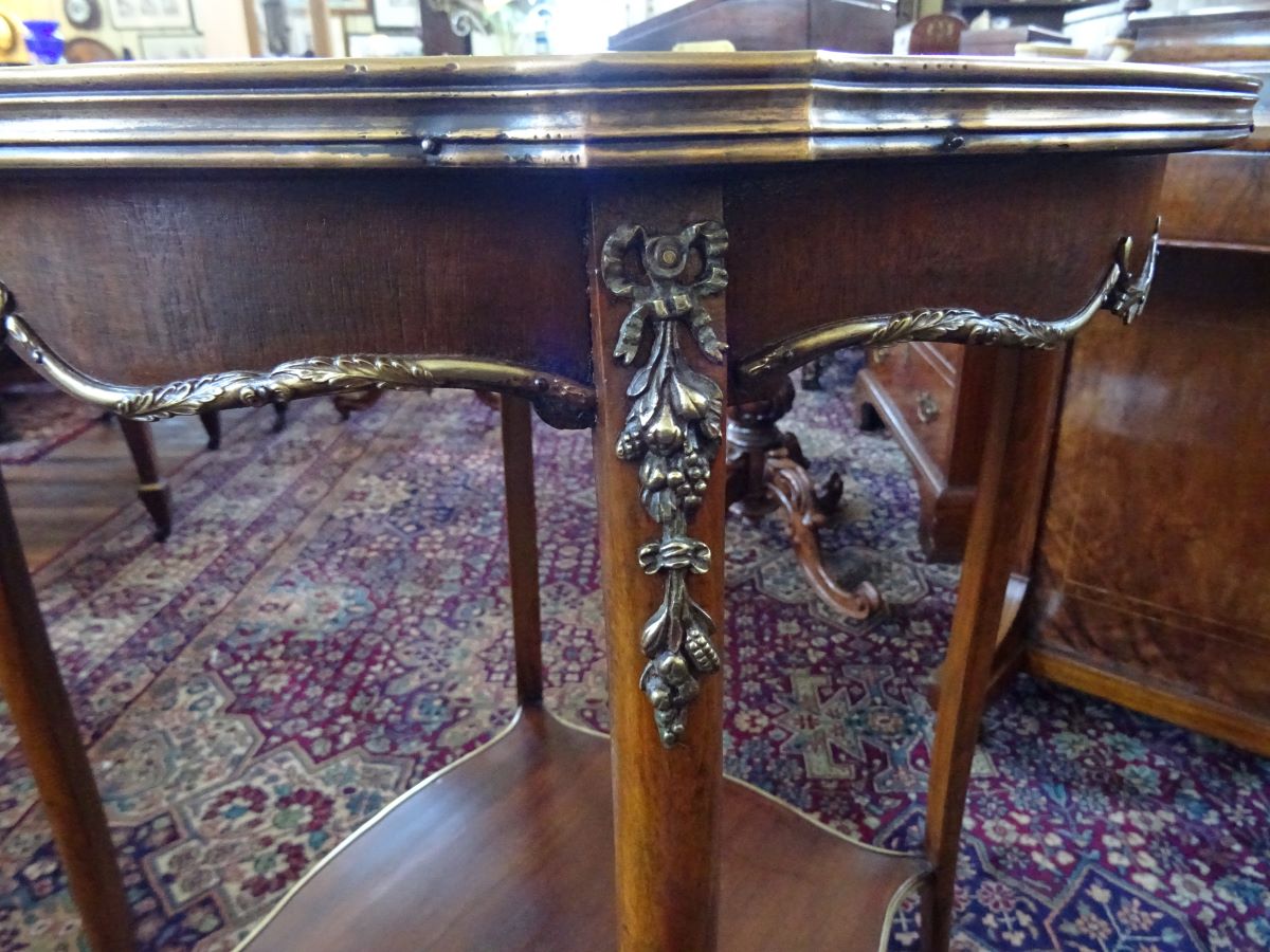 Here is a good quality ornate rosewood & marquetry inlaid 2 tier centre table with ornate mouldings and mounts. Measures 22½'' across and stands 28½'' high.